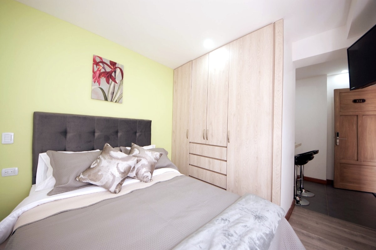 Stiúideo Mini iontach leis an radharc is dochreidte ar Bogotá. Áit dhraíochtúil, bharántúil, chiúin, ghlan, chompordach agus fháilteach. Foirfe do thaistealaithe rómánsúla, do dhaoine a bhfuil dúil acu i luí na gréine agus ar mór acu rochtain a bheith acu ar an teach ósta is fearr in Bogotá díreach os a gcomhair le linn a bhfanachta, le seirbhísí uile an bhrú, ióga, ranganna salsa, beár, bialann agus eolas turasóireachta den scoth. Tá sé ar urlár 5 agus mar sin is é sin an radharc iontach, gan ardaitheoir.