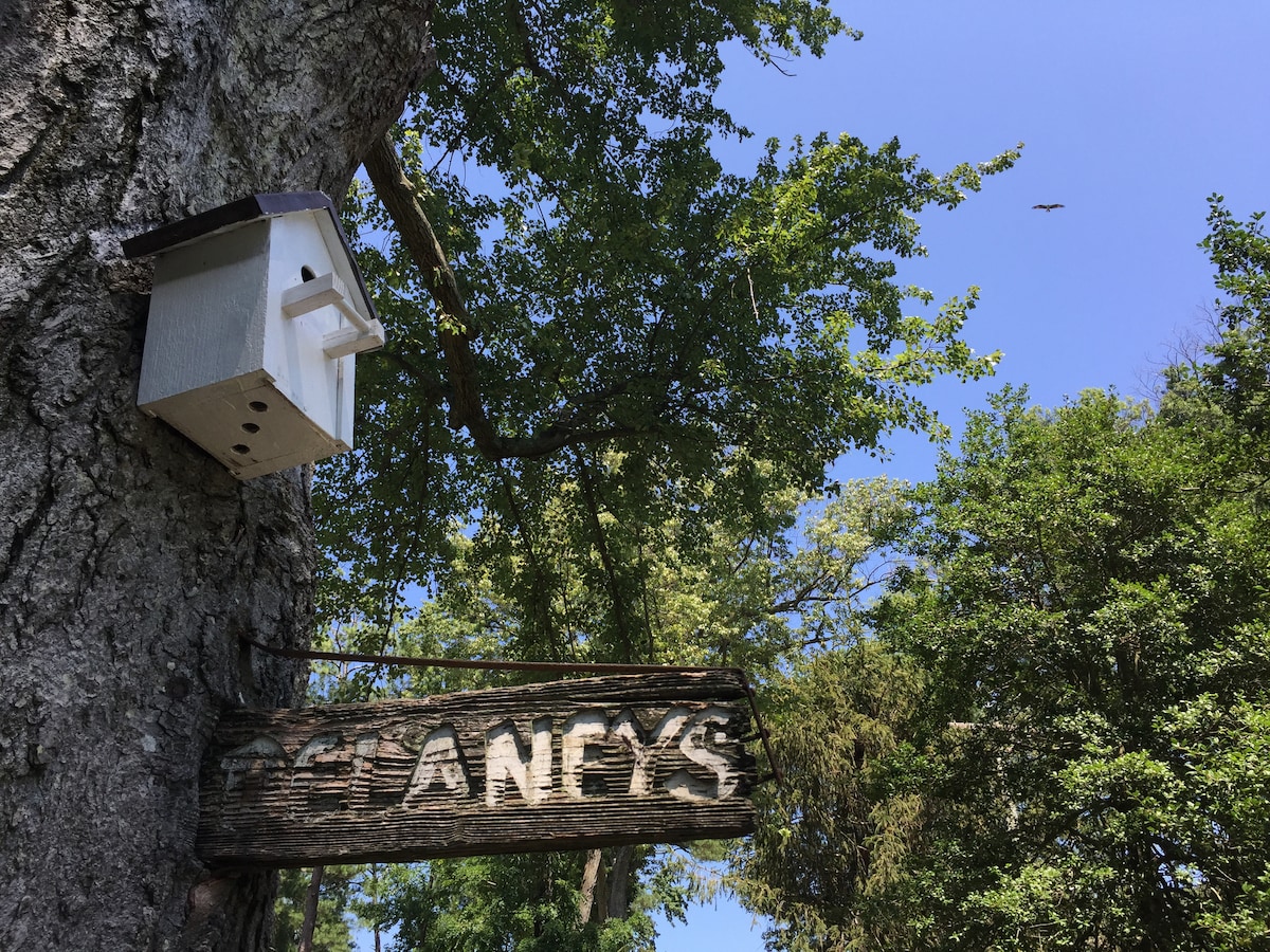 Freastalaíonn Delaney's Compound Guest House ar suas le 4 aoi. Tá fáilte roimh mhadraí le réamhcheadú & táille $ 75 (don chéad pheata). Coinníonn clós beag fálaithe sábháilte iad! Tógadh an Teach Aoi ag baint úsáid as lumber athshlánaithe agus gnéithe gleoite eile ón bhfoirgneamh seachtrach bunaidh tí feirme (thart ar 1889). Tá teallach teolaí ann le haghaidh smuigleála agus balcóin dara hurlár le haghaidh caife nó manglaim. Tá poll dóiteáin agus radhairc abhann ar an gclós tosaigh. Tá an Teach Aoi iontach glan, lán troscáin agus réidh le fáilte a chur romhat!