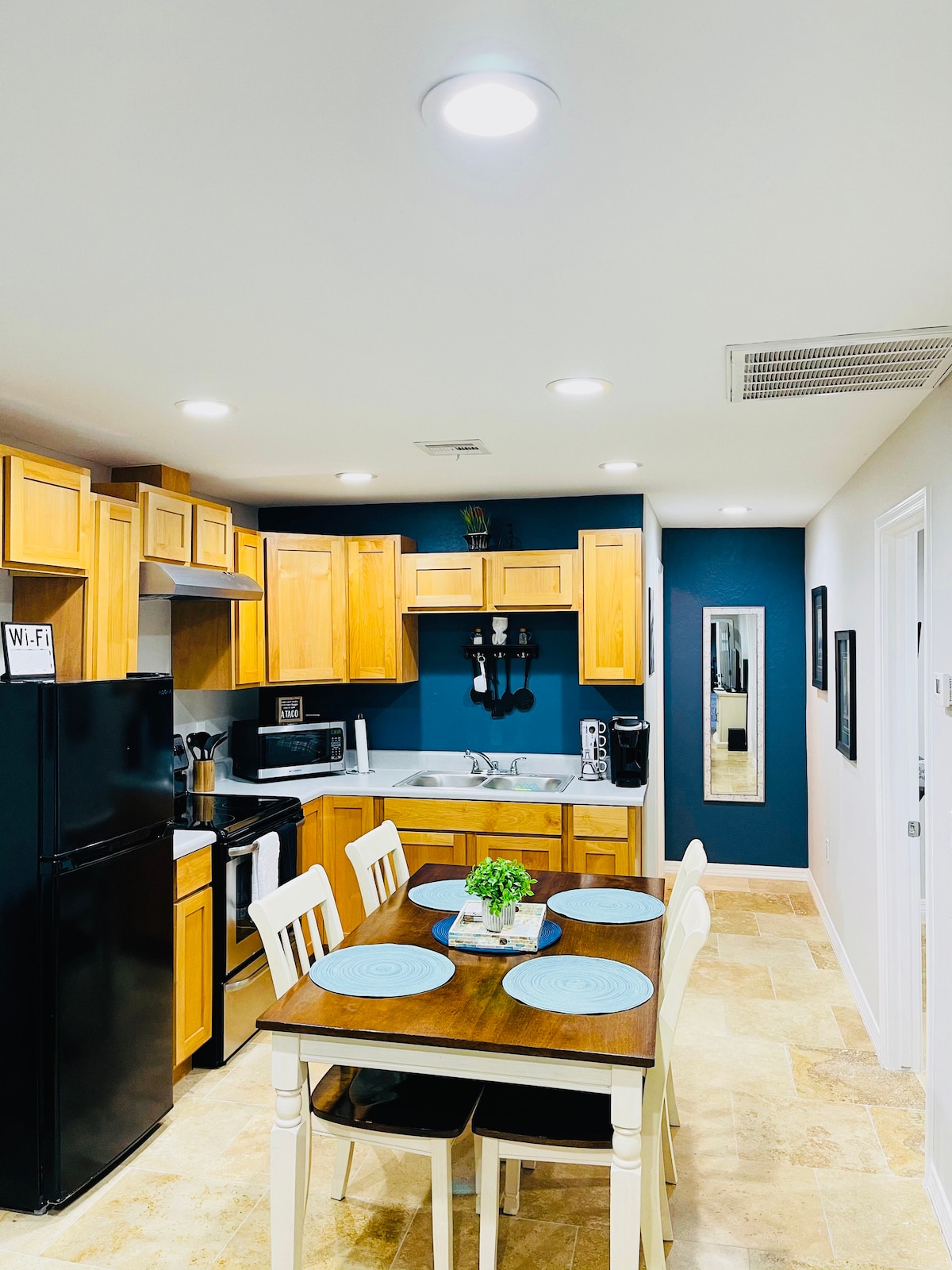 Rinne dearthóir gairmiúil (@ designxwoods) an teach seo a athchóiriú agus cuireann sé sonraí uathúla agus bailchríocha spreagúla timpeall gach cúinne ar taispeáint! Bain sult as an solas nádúrtha sa spás maireachtála aerach agus oscailte atá clúdaithe i brící bána agus fiú dul suas an dréimire go dtí an lochta ar feadh nóiméad machnaimh. Idir na feistis reitreo agus na hurláir chrua - adhmaid darach agus na seomraí folctha cosúil le spá, tá an teach te agus gleoite agus lán le saoráidí chun d'fhanacht a dhéanamh compordach. Tá sé foirfe do ghrúpaí níos mó nó do theaghlaigh atá ag iarraidh fanacht cluthar in aice leis na bialanna agus na siopaí is fearr atá le tairiscint ag Phoenix. Cuireann an paitió brící ar ais rogha itheacháin al fresco iontach ar fáil leis an luí na gréine álainn Arizona. Séanadh: Ar mhaithe le do shábháilteacht ár réadmhaoine agus ár n - aíonna, tá ceamara faireachais amháin suiteáilte ar an bpóirse tosaigh. Tá rochtain ag aíonna ar an teach iomlán, lena n - áirítear paitió cúil. TABHAIR FAOI DEARA: Tá rochtain ar an lochta trí dhréimire cruach atá daingnithe ar an mballa. Iarraimid ar aíonna dréimire a úsáid go cúramach agus ar a bpriacal féin. Táimid ar fáil i gcónaí ar an bhfón nó tríd an aip. Tá an teach i gCeantar Stairiúil Coronado, pobal ciúin cónaithe de theaghlaigh agus d'ealaíontóirí óga. Tá roinnt bialann agus siopaí caife faoi fhad siúil. Tá Downtown Phoenix 5 nóiméad sa charr uait. Tá fáilte roimh aíonna páirceáil ar an gcabhsa gairbhéil, is féidir le dhá charr a bheith oiriúnach i dteannta a chéile. Tá uasmhéid dhá charr againn ag an réadmhaoin. TABHAIR FAOI DEARA: Tógadh grianghraif an liostaithe sular suiteáladh na cóireálacha fuinneoige. Tá painéal drapery blackout sa phríomhsheomra leapa faoi láthair. Tá scáthláin rollála lándorchaithe i seomraí leapa na n - aíonna agus tá scáthláin rollála phríobháideachais ag fuinneoga an tseomra suí.