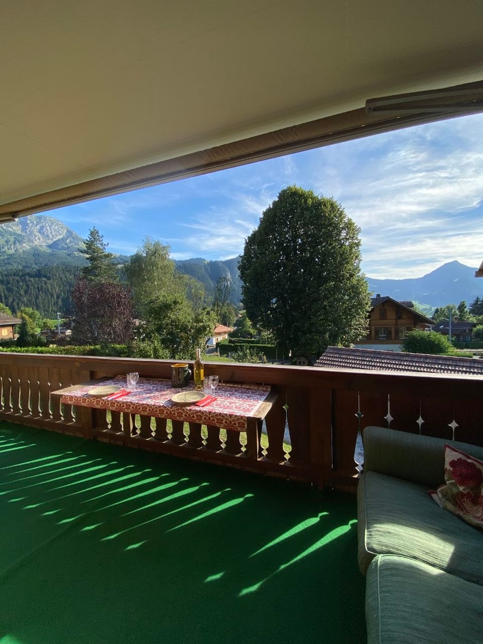 Árasán álainn áiléir i sealla gradamúil in aice le Gstaad. Radharcanna iontacha ar na sléibhte, suíomh ciúin gan mhórbhealach. 3 sheomra 2 sheomra leapa ina bhfuil 4 leaba 4 dhuine ar a mhéad 5 nóiméad sa charr chuig lár an tsráidbhaile, carr cábla agus ollmhargadh Halla isteach, cistin oscailte, seomra suí ina bhfuil teallach agus tábla bia, 2 sheomra ina bhfuil leapacha dúbailte. 1 seomra folctha ina bhfuil guairneán, cithfholcadán/leithreas Iodálach agus leithreas ar leith. Meaisín níocháin agus triomadóir. Balcóin an - mhór atá os comhair an deiscirt.