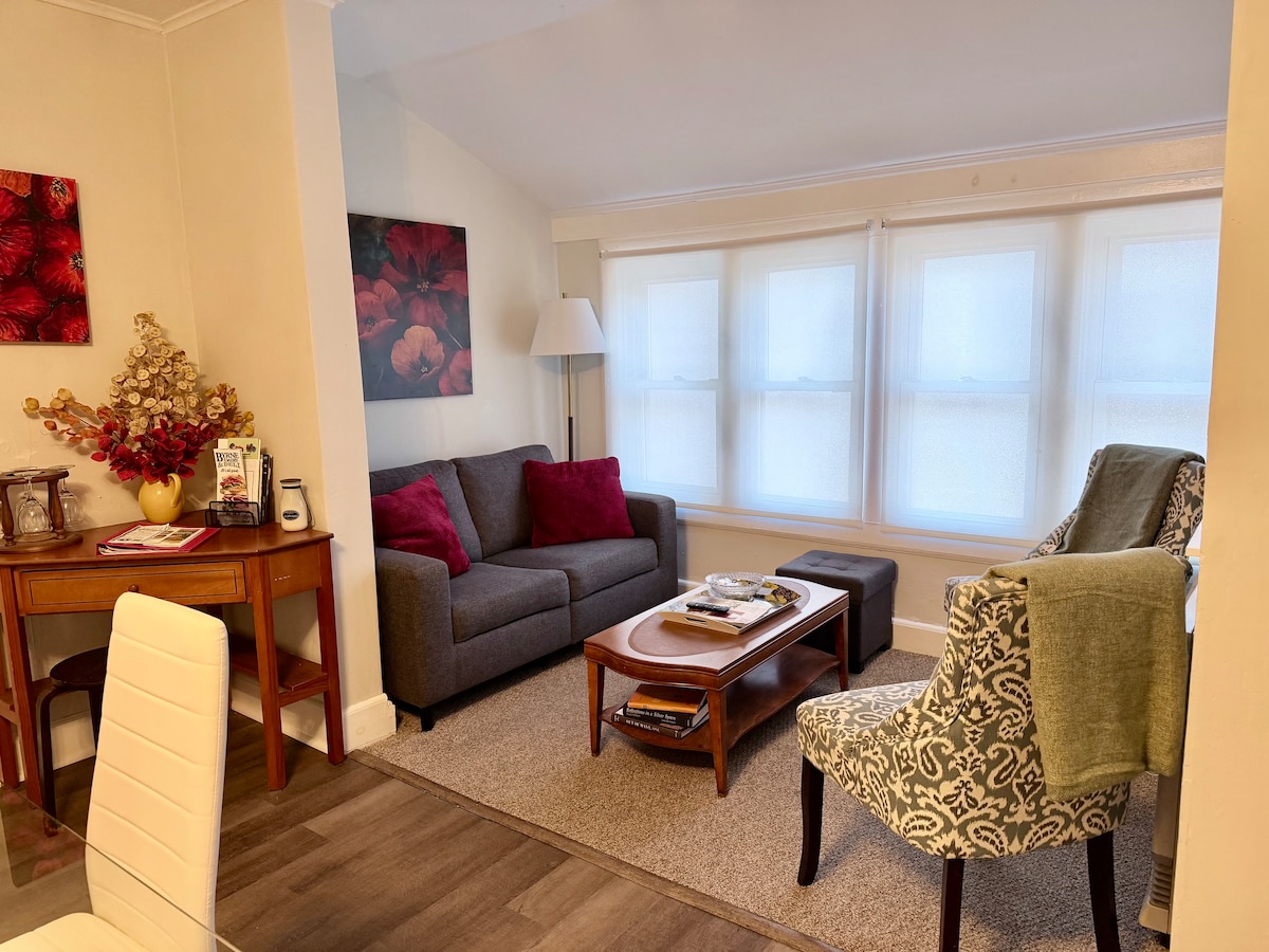 Located in the Museum District of downtown Norwich, this spotless ground-floor suite is just blocks from restaurants and attractions. With only four steps to enter, it’s easy and accessible, ideal for all guests. A king-size bed in the main bedroom, a roomy kitchen, and a coffee/tea bar. Private parking and in-unit laundry make your stay even more convenient. For relaxation, enjoy the cozy bedroom fireplace or unwind in the garden tub. Our senior guests rave about the welcoming experience.