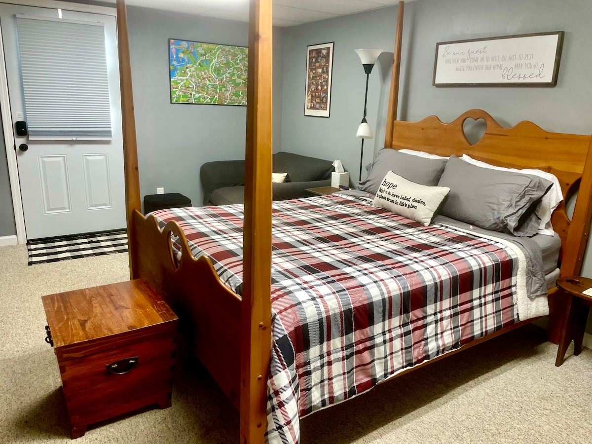 Lig do scíth agus lig do scíth i do sheomra compordach le bealach isteach príobháideach ó do lochtán. Bain sult as do theilifís 40 orlach ón leaba iomlán compordach. An dteastaíonn seomra uait chun roinnt oibre a dhéanamh? Tá bord caife agus cathaoireacha deasa agat i do sheomra agus amuigh ar do phaitió. Tá doirteal beag, cuisneoir suanleasa, micreathonnán, pota te, gléas caife sileadh/Keurig, miasa, agus caibinéid stórála i do chistinéad. Bain sult as tuáillí boga bána agus braillíní boga. Tá iarann agus clár iarnála agat freisin.