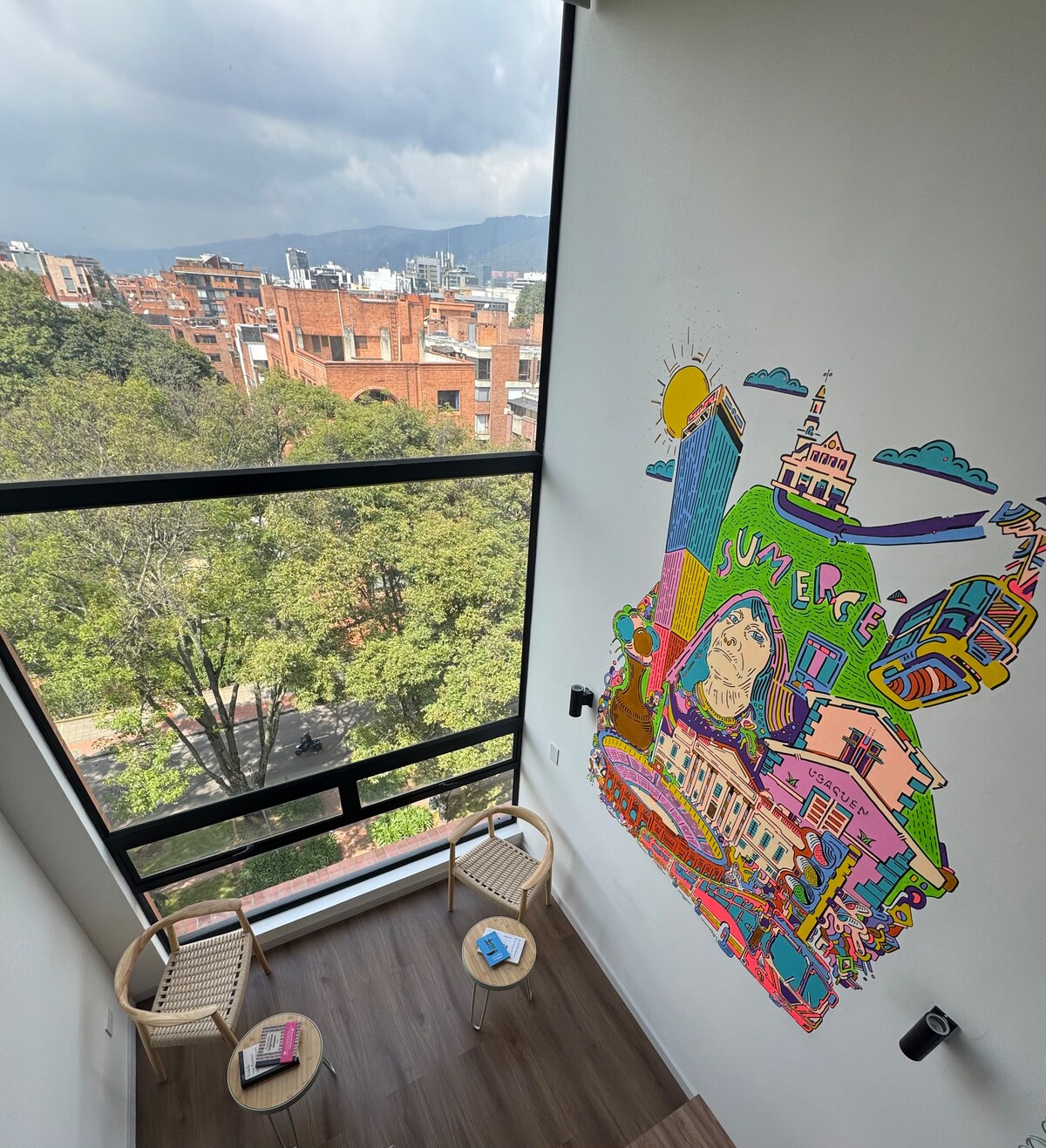 Brand-new designer loft with park views in the heart of Chicó, one of Bogotá’s most exclusive neighborhoods—just steps from Parque 93, top restaurants, and cafés. Surrounded by vibrant city life yet filled with the calm of nature right outside your window. Thoughtfully designed with contemporary art, greenery, and cozy touches. Includes a fully equipped kitchen, fast Wi-Fi, smart TV with streaming, and a workspace—perfect for business or leisure.