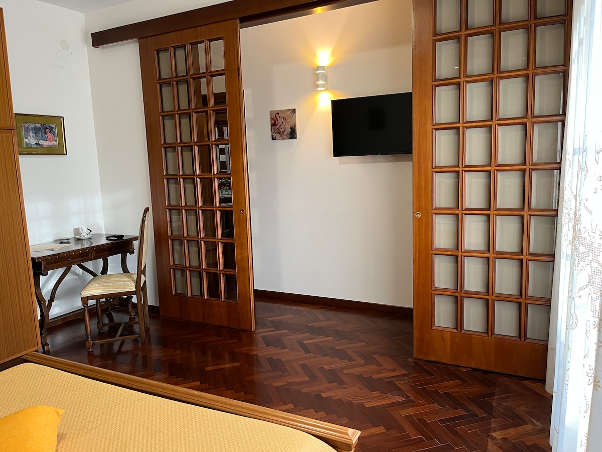 Árasán ina bhfuil seomra leapa dúbailte, seomra suí, leaba thoilg, cistin, seomra folctha, balcóin ag breathnú amach ar Maiella agus thar an ngleann , radharc farraige Aidriad. Tá an t - áitreabh suite ar urlár na talún de chuid de villa timpeallaithe ag crainn olóige ar chnoc CittàSant'Angelo , ceann de na sráidbhailte is áille san Iodáil thart ar 10 km ó bhealach amach A14 de Pescara Nord. Tá aonad cónaithe eile an villa á áitiú ag an úinéir. Ideal le haghaidh fanacht suaimhneach idir tránna agus sléibhte.