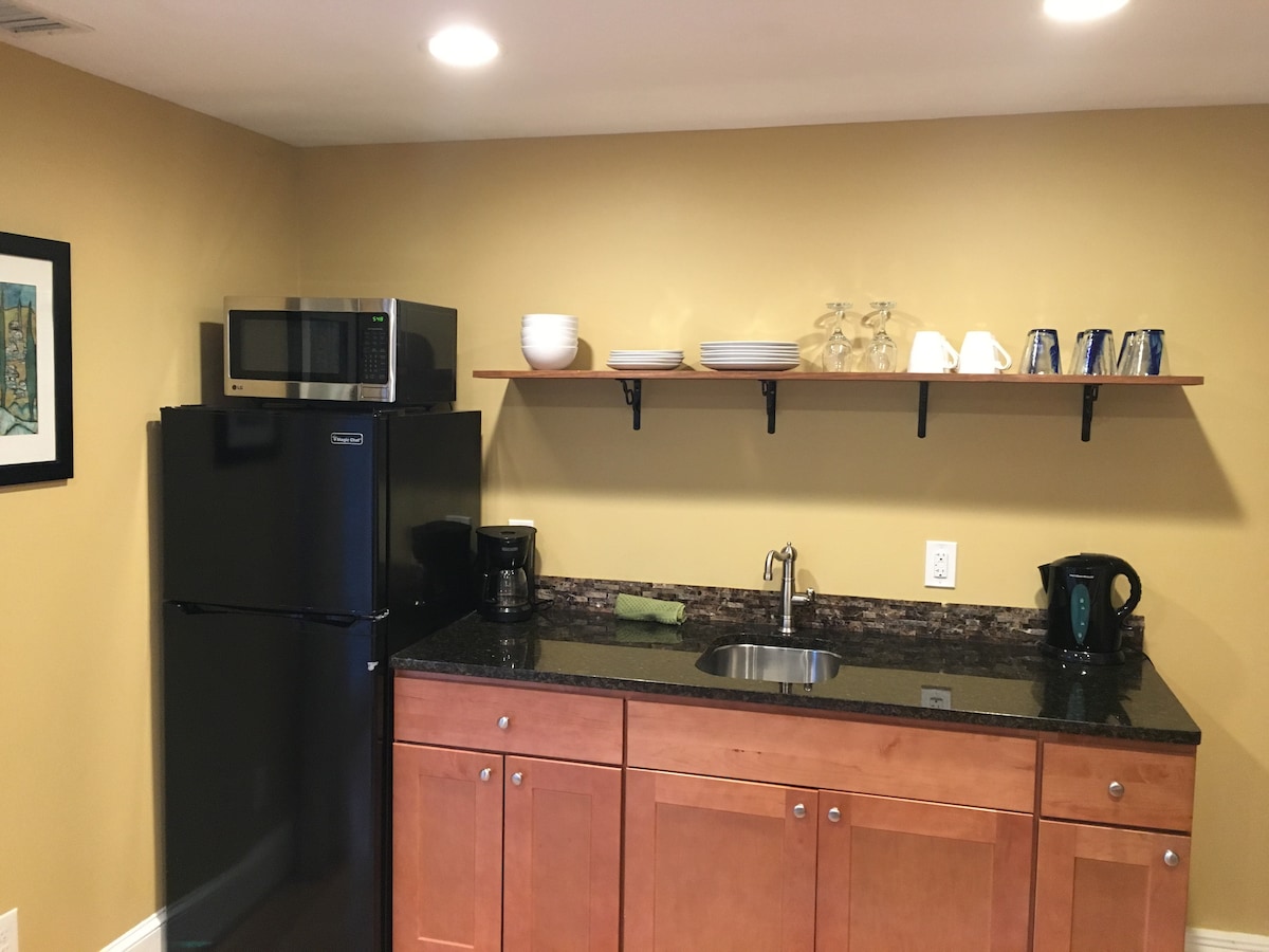Is fearr a shainmhínítear an svuít muintire seo mar árasán beag atá ceangailte le teach; bealach isteach, seomra folctha, cistin & páirceáil saor in aisce féin! Leaba bhanríona, braillíní glana, tuáillí, iarann, clár, potaí cistine, bord bia, teilifíseán agus eile. Tá sé beag ach leis na saoráidí go léir is gá chun cónaí. Má tá spás ollmhór á lorg agat, ní hé sin a bheidh ann. Go maith do dhuine singil/lánúin ag cúrsáil ag an DMV ar BHUISÉAD! Siúl 20 nóiméad go dtí an meitreo; amach ó theorainn DC, 18 nóiméad sa charr go lár na cathrach.