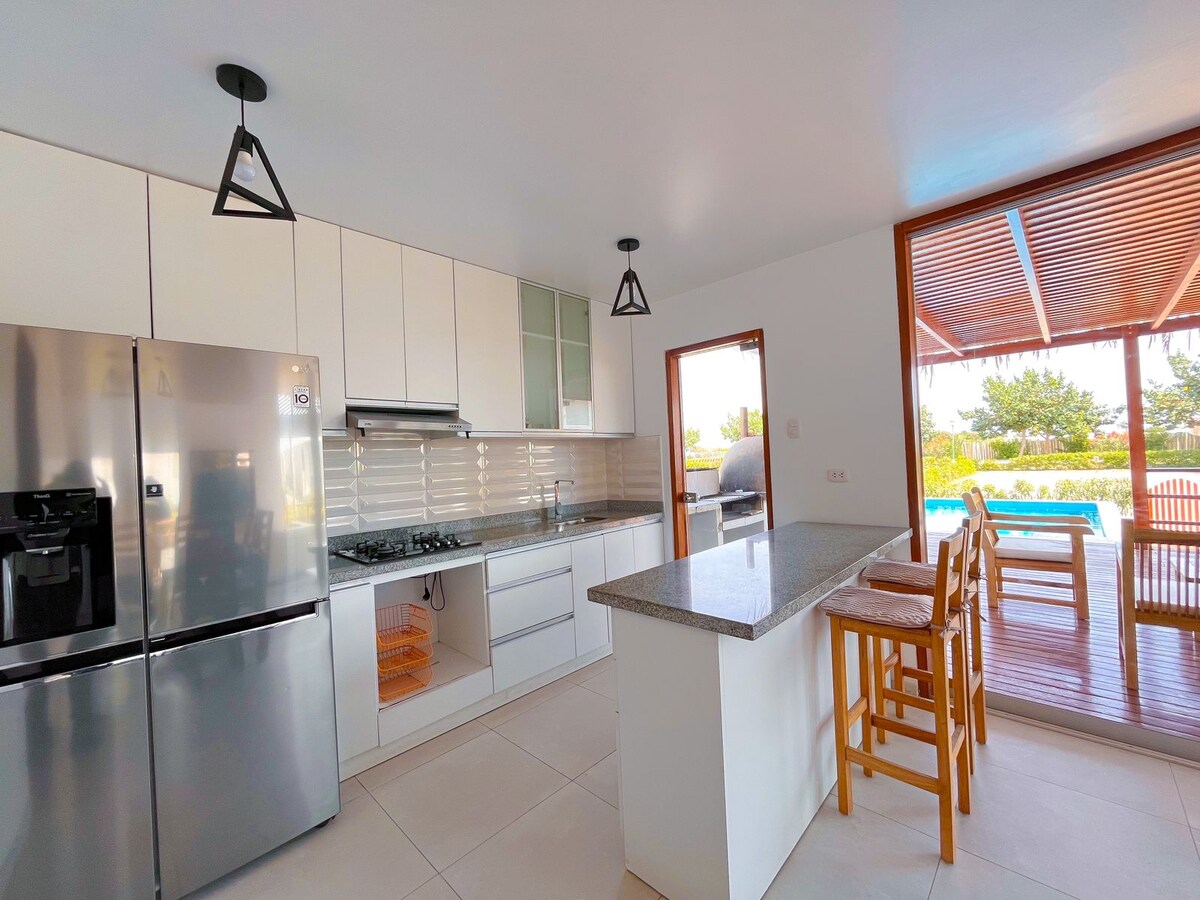 Teach fairsing agus lánfheistithe. - Codlaíonn 14 i 14 - Cistin feistithe le cuisneoir doras 02 le sorn oighir. - Seomra bia. - 02 Salas - Cúig sheomra leapa, lena n - áirítear éadaí leapa - 4.5 baños - Ardán le troscán, gríoscán, oigheann lámhdhéanta - Níochán - teilifís chábla. Wi - Fi, - Carrchlóis. - Linn snámha phríobháideach - Áiteanna coiteanna: Linn snámha, cúirt sacair agus leadóige, leadóg bhoird, farraige álainn le limistéar mór trá.