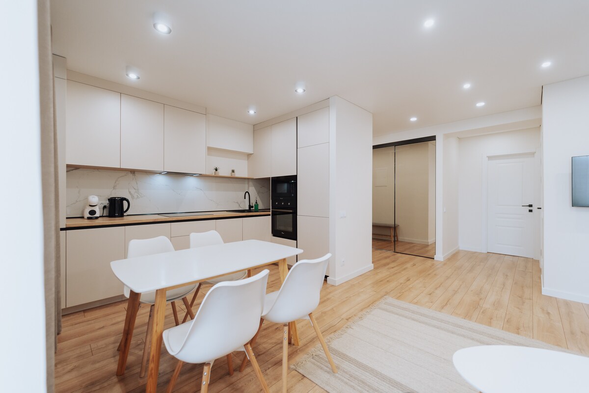 🥂 Fáilte go dtí ár n - árasán 1 sheomra leapa atá spreagtha ag Lochlann i lár Chisinau. ✨Tá áit mhaireachtála plean oscailte agus feistis nua - aimseartha le feiceáil sa spás teolaí íostach seo. Tá páirceáil🅿️ saor in aisce ar fáil in aice leis an bhfoirgneamh agus os a chomhair, rud atá thar a bheith neamhchoitianta sa lár. 📺 Bain sult as áisiúlacht miasniteora, meaisín níocháin, triomadóir tumble, meaisín caife, teilifís, Wi - Fi, aerchóiriú, agus go leor stórála. Agus tú suite go🎯 hidéalach i lár na cathrach, tá tú gar do chaiféanna, do shiopaí agus do nithe is díol spéise.