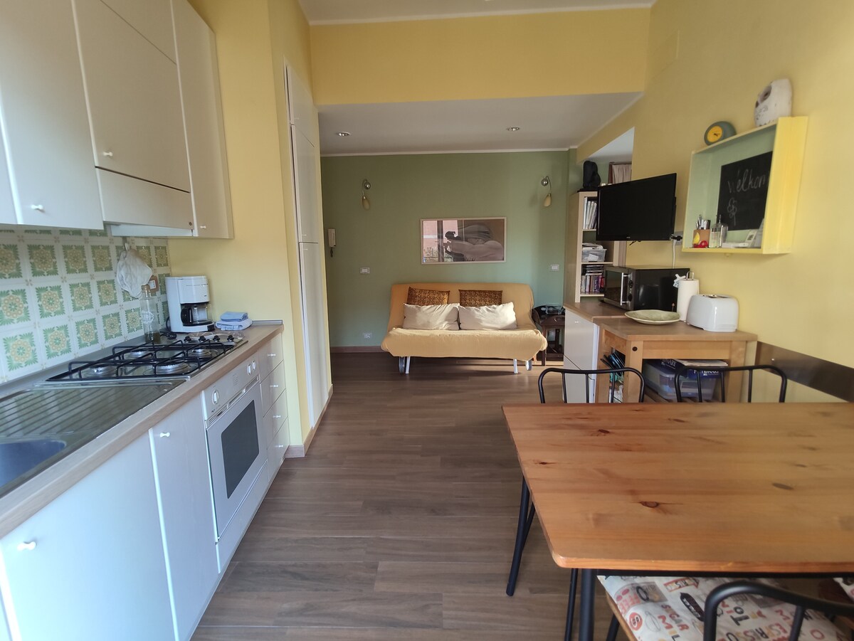 Tá an t - árasán 10 nóiméad ag tiomáint ó aerfort Ciampino. Stopann an bus ón aerfort i gcearnóg Leonardo da Vinci in aice leis an árasán agus ag an stáisiún traenach. Tá an t-árasán i lár Ciampino, 4 nóiméad siúil ón stáisiún traenach. Is furasta duit stáisiún lárnach Roma Termini a bhaint amach i gceann thart ar 15 nóiméad (3/4 traein in aghaidh na huaire). Tá roinnt ollmhargaí, siopaí, bialanna agus píotsaerí in aice láimhe. Tá an t-árasán compordach do bheirt nó do thriúr, ach tá spás ann do chúigear.