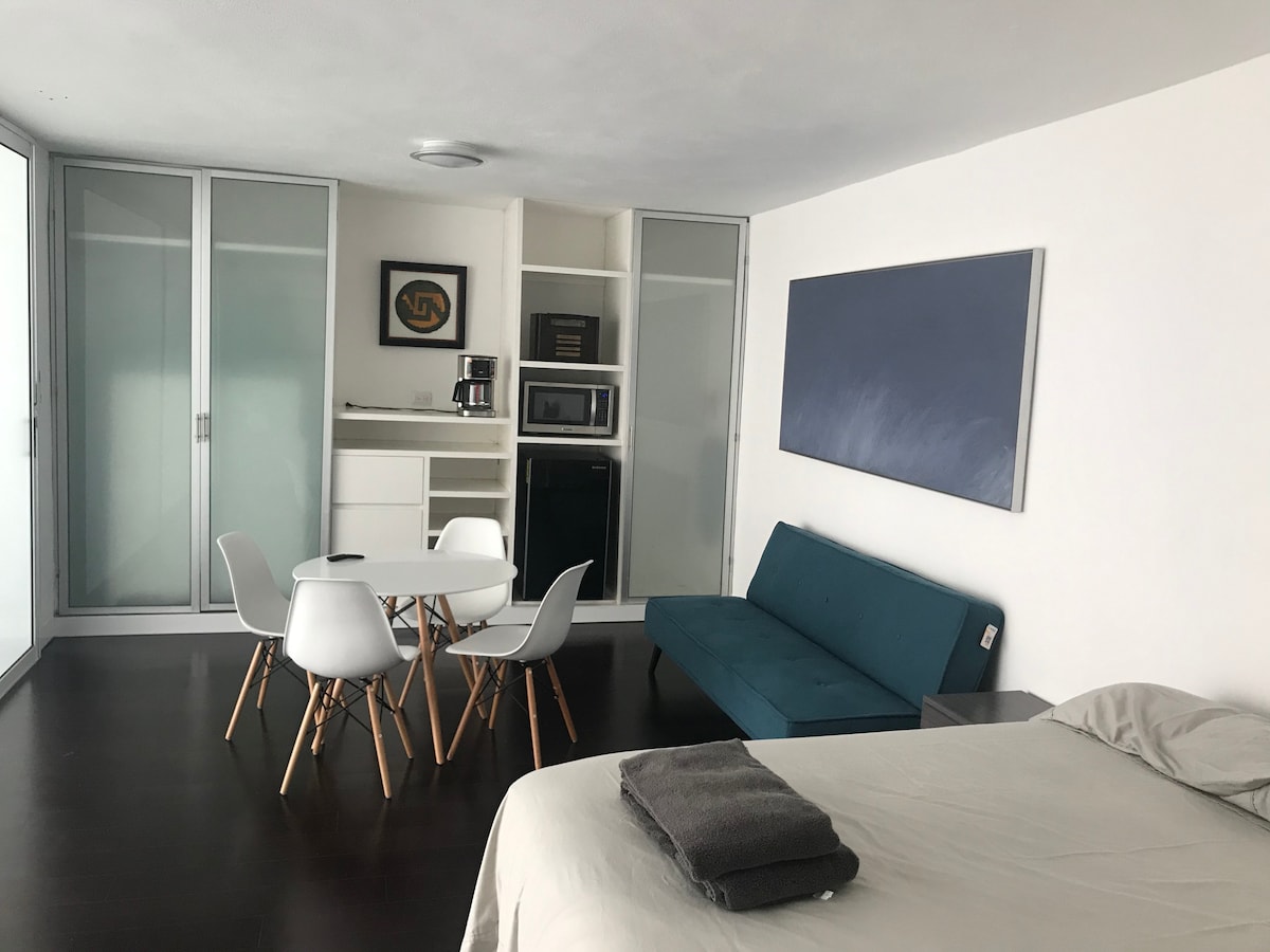 Árasán cluthar nua - athchóirithe i gceann de na comharsanachtaí is deise in Monterrey, in aice le Calzada del Valle agus príomhionaid siopadóireachta. Seomra leapa ciúin le deasc, mionbheár agus micreathonnán. Bain sult as an ngairdín le beárbaiciú. Wi - Fi agus bealach isteach príobháideach. Is é an t - aon spás comhroinnte an halla taobh amuigh chuig do shvuít, rud a chinntíonn príobháideacht. Tabhair faoi deara nach bhfuil aon pháirceáil phríobháideach ann, ach tá carrchlós poiblí ar fáil ag páirc in aice láimhe. Táimid anseo lena chinntiú go mbeidh eispéireas speisialta agat inár gcathair. Fáilte!