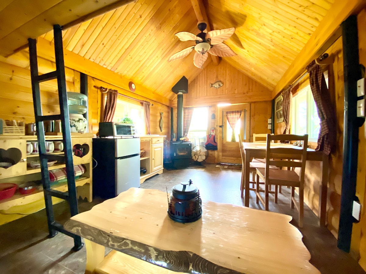 Bain sult as na radhairc lánléargais, as an aer úr sléibhe agus as na hoícheanta dorcha réaltaí ón teach cluthar seo ar an sliabh atá suite i Sléibhte Creagacha Cheanada. Tógadh an cábán mar áit chun go mbéarfaidh an saol orainn agus chun athcheangal lena chéile. Caith do thráthnóna in aice leis an teallach cloiche le leabhar maith, nó déan marshmallows a róstadh timpeall ar an bpoll tine lasmuigh le cairde. Ón gcábán tá rochtain éasca ar go leor easanna, siúlóidí, iascaireacht, cosáin d'fheithiclí tírelach, marcaíocht ar chapall agus go leor eile.