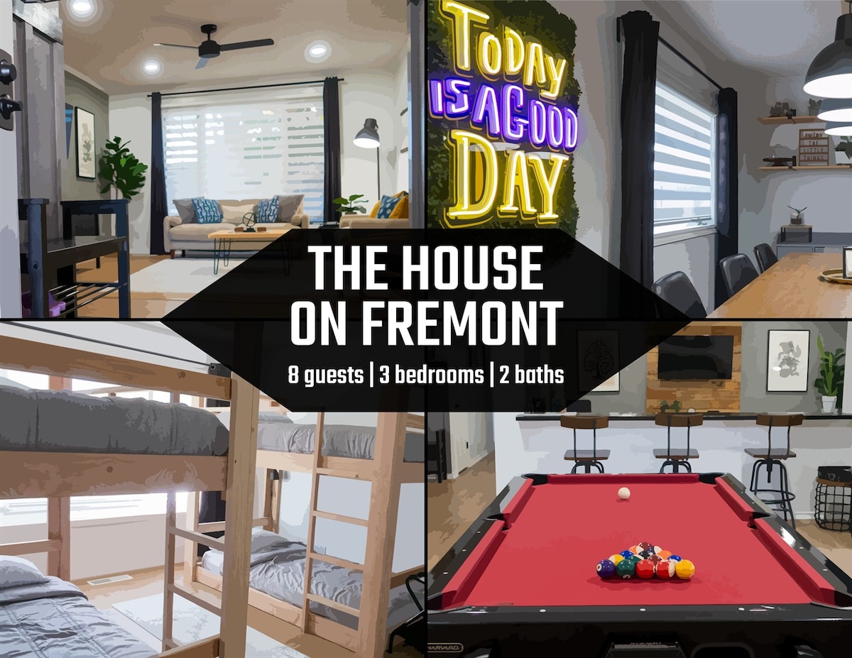 Beautiful and newly updated 3 bed/2 bath home in North Fresno with a game room, pool, BBQ and play area! Includes 3 car garage! Comfortably fits 10. Includes 1 king bed, 2 queen beds, 2 sofas and 1 queen-size air mattress Game room includes a foosball table, air hockey table, and a variety of family-friendly games. Beautiful backyard with pool, BBQ, comfortable outdoor furniture, and play area for kids with swings! Great for business professionals, large families, or groups of travelers.