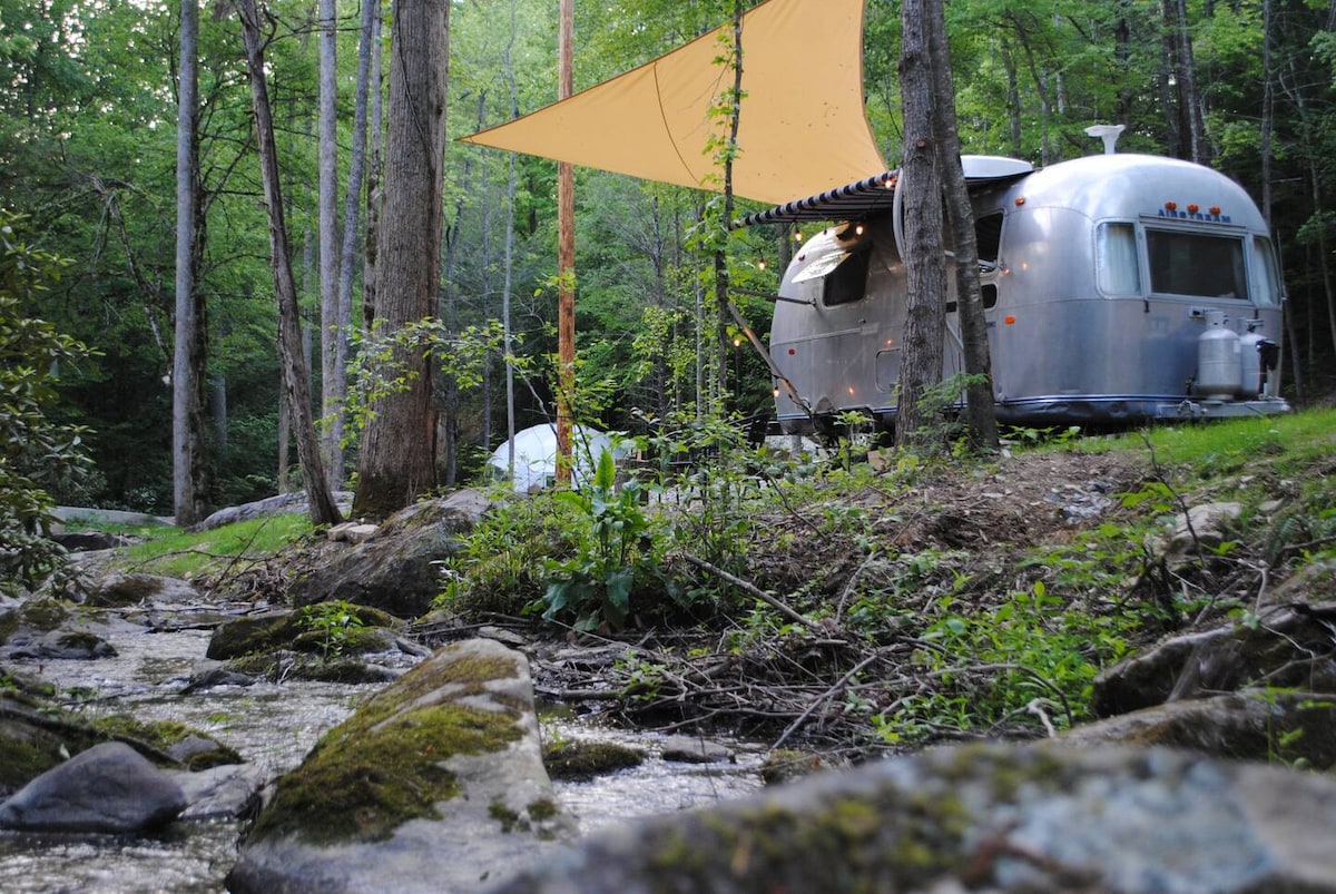 Buail lenár n - Airstream a fheictear 1972 darb ainm Frida. Buailfidh boho geal le maisiúchán retro tú chuig d'áit shona in am ar bith. Fág imní taobh thiar de agus bain sult as cuideachta an duine is fearr leat leis an gcistinéad gleoite, áit bheag bhídeach ach álainn fliuch, leaba chompordach - theocht & níos mó. Fáilte chuig Wanderlust Woods, réadmhaoin 10 n - acra i bhfolach le creek ag sileadh, radhairc sléibhe & go leor spáis le dul ag spaisteoireacht. Nóiméid ó raftú ar abhainn an Choilm nó ag fánaíocht sa Pháirc Náisiúnta & 25 nóiméad go Gatlinburg.