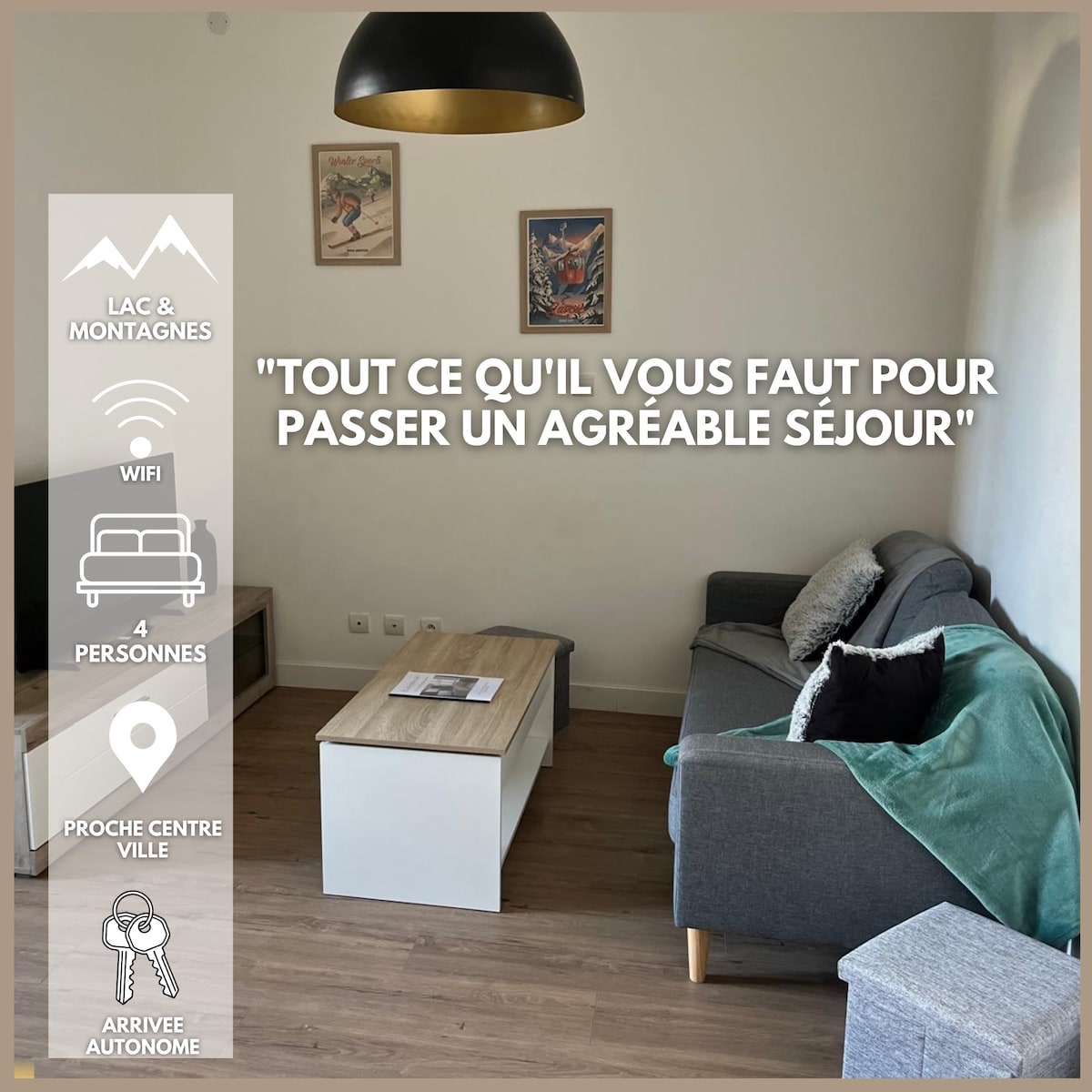 T2 50 m2, lumineux, cosy pour 2 personnes. balcon 12 m2, 4e étage, ascenseur, vidéophone. Cuisine moderne équipée, coins salle à manger et salon avec télé. fibre wifi - Chambre séparée - 1 lit 160X200. Matelas haute qualité . Grande salle de bain - baignoire et pare-douche, lave linge. Centre ville, rue calme, très proche gare SNCF et routière, du Parc de verdure "Le Verney", commerces tout proche - 1 place parking pour véhicules petits et moyens gabarits. Non fumeur. Pas d'animaux.