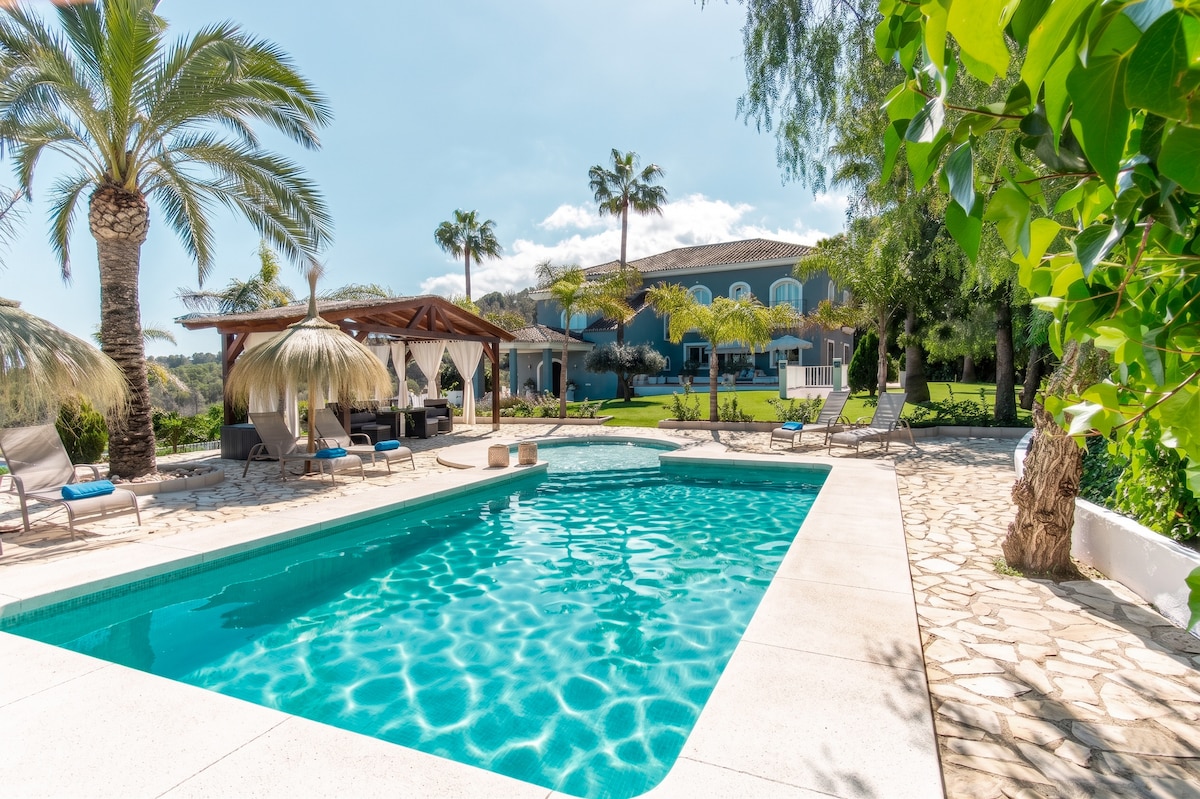 Tá Villa Monte Elviria suite 8 nóiméad ó na tránna is fearr in Marbella, suas cnoc le radhairc mhaorga thar an bhfarraige, Giobráltar agus sléibhte oidhreachta domhanda UNESCO Sierra de las Nieves, gnéithe an villa: - Linn snámha mhór éigríoch a THÉITEAR I RITH NA BLIANA - Gairdín ina bhfuil gairdíní crochta, paitió Spáinneach, ardáin agus faiche -5 sheomra leapa mhóra lena n - áirítear 4 sheomra folctha ar an láthair ina bhfuil leapacha rí - mhéid den scoth (ar fáil i leagan amach cúpla freisin) - Pictiúrlann agus tábla linn snámha atá lánfheistithe - A/C ar fud
