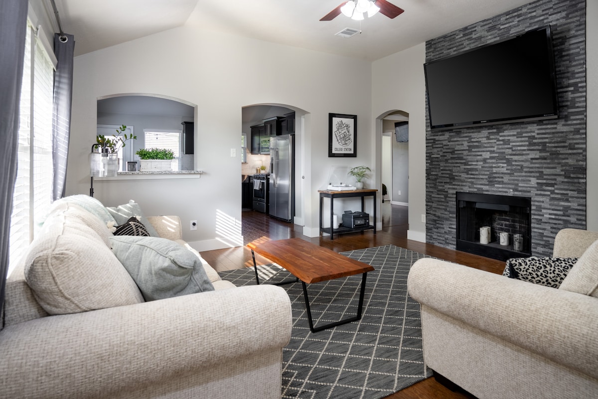 Haigh! Fáilte chuig an teach gleoite seo i gceantar stairiúil Bryan! Téigh ag spaisteoireacht 10 nóiméad go dtí an lár, bainfidh tú sult as bia áitiúil, ceol agus siopadóireacht. Foirfe do chuairteanna Texas A&M, an Chéad Aoine, agus Santa's Wonderland. Níl Kyle Field agus Olsen Field ach 6 mhíle ar shiúl! Tá 1 rí, 1 bhanríon, agus 2 leaba chúplacha sa teach nua - aimseartha seo, agus tolg d'aoi breise. Lig do scíth sa chúlchlós príobháideach le poll dóiteáin agus poll coirnéil. Bain sult as teilifíseán 65"le fuaim timpeall Sonos. Cuir in áirithe anois é agus faigh blaiseadh den chuid is fearr de Bryan!