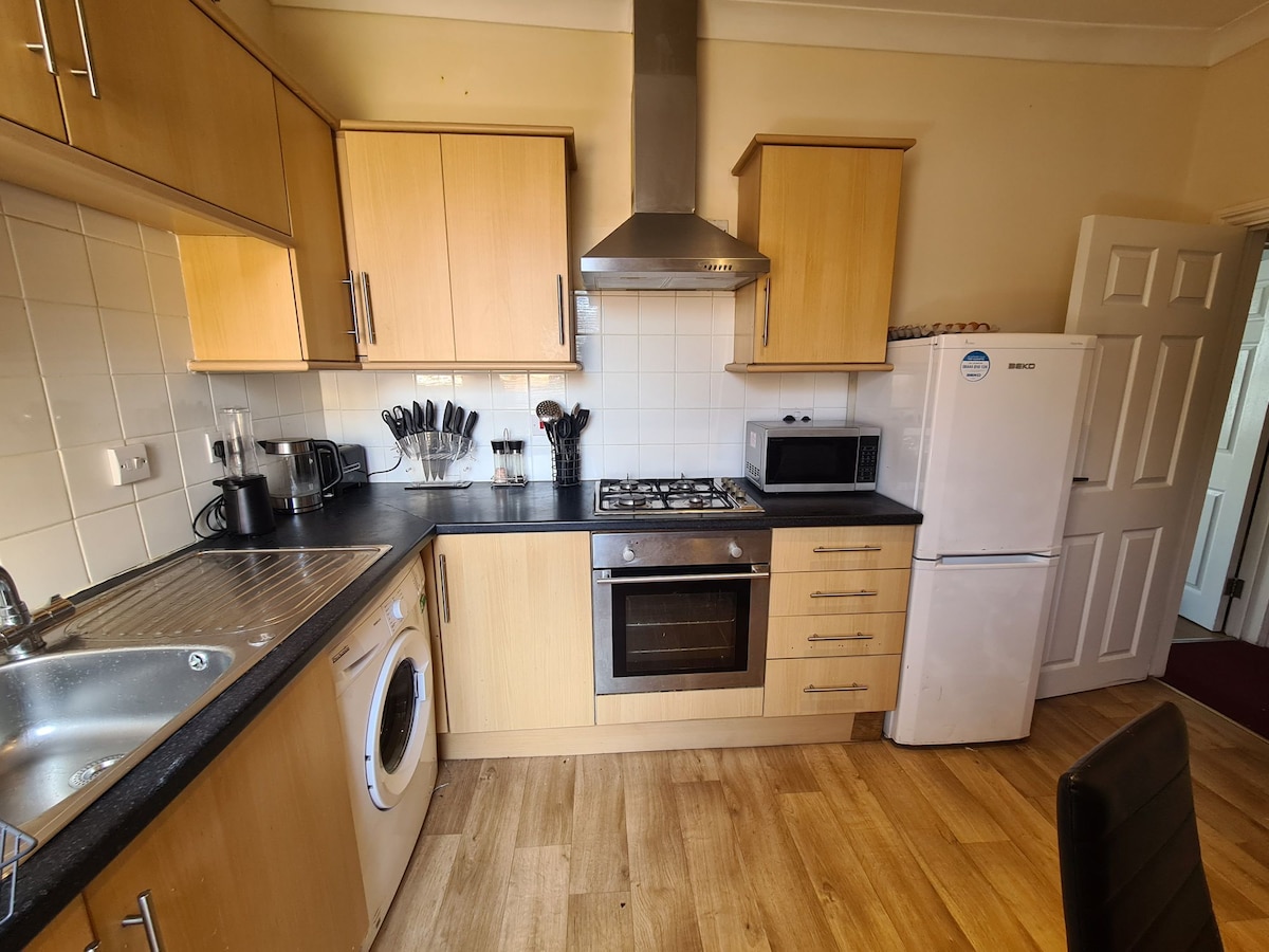 2 Bedrooms furnished with award winning OTTY mattresses for a deep sleep, sliding mirrored wardrobes and ample storage for your belongings. Luxury bathroom with steel bathtub and shower facility. Open plan Living room/ Dining and Kitchen area, Crystal chandelier to light your space to a Snooker/ Pool table, 55" smart TV, Cosy L Sofa, Smoked Glass Coffee and Dining table. Well stocked kitchen with appliances including a washing machine and dishwasher.