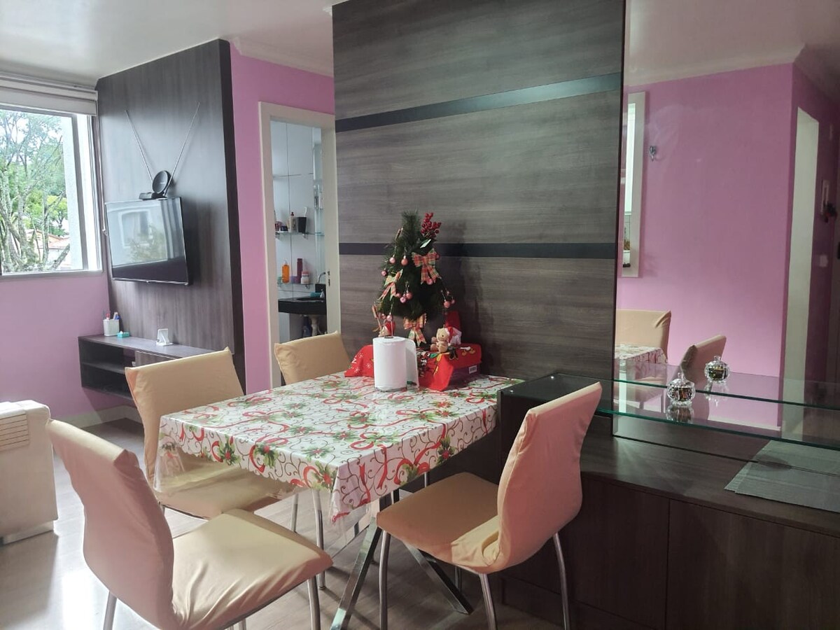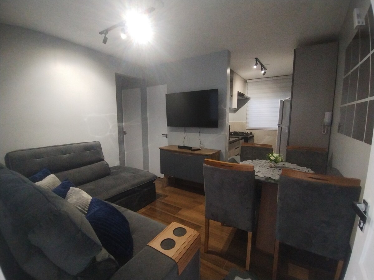 Apartamento aconchegante completo, equipado com Wi-Fi, TV 55" com Netflix e TV aberta, secador de cabelo e outros. Condomínio residencial tranquilo e seguro com uma vaga de garagem. Ponto de ônibus em frente ao portão. Somos amigos dos vizinhos, por isso, a boa convivência e respeito, especialmente com barulhos é fundamental.