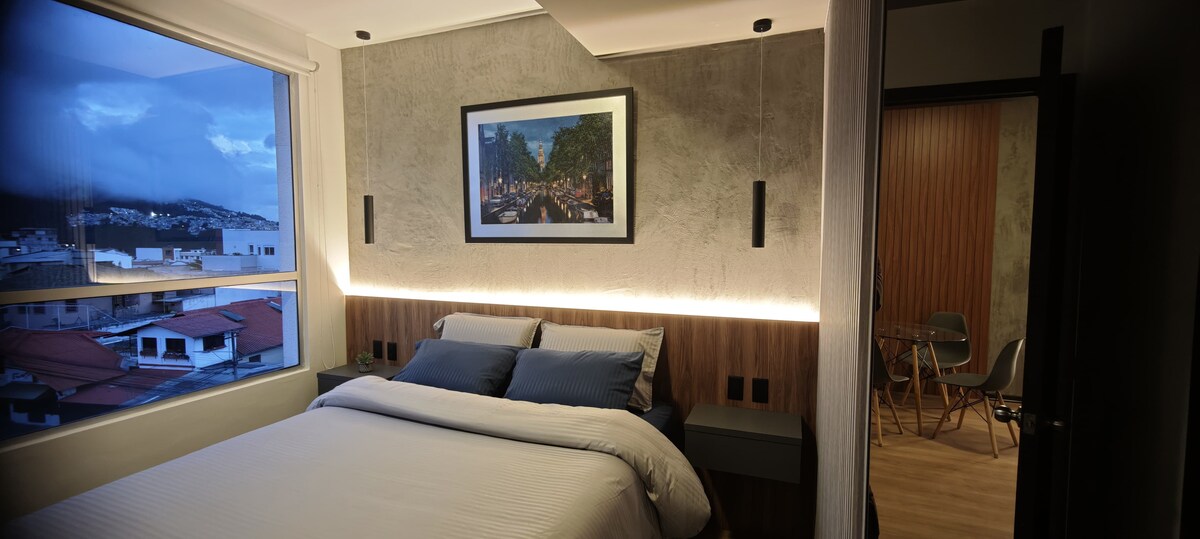 Svuít cúinne le fuinneoga ó urlár go síleáil agus balcóin, le radhairc lánléargais ar bholcán Pichincha agus ar an gcathair. Suite i gceantar Plaza Artigas (Av. 12 de Octubre), 3 nóiméad ar shiúl ó Swissotel. Tá páirceáil (1 fheithicil) agus seiceáil isteach 24/7 le doirseoir san áireamh. Wi-Fi seasmhach agus bord itheacháin atá oiriúnach don obair. Tá Supermaxi, Fybeca agus La Carolina Park thart ar ~15 nóiméad ar thacsaí/carr.