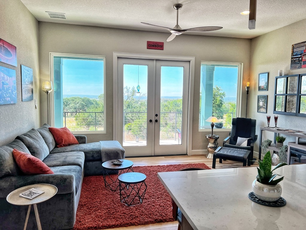* Tá an loch 100% lán ón 8/5/25 agus tá rampa báid Llano saor in aisce ar oscailt ar fud na sráide !* Tóg suas Tír Chnoc Texas ag ár n - árasán folctha 1 seomra leapa 1. Tearmann 450 troigh chearnach le radharc locha ón bpóirse, spás ciúin fuaimdhíonta (críochnaithe 3/15/2025) le haghaidh bunáit nó tearmann suaimhneach tí. Tum thú féin i ndraíocht lochanna, fíonlanna, rochtain ar Shliabh Spider, fánaíocht agus uaimheanna nádúrtha in aice láimhe. Déan iniúchadh ar Pháirc Stáit na Carraige Duibhe in aice láimhe chun rochtain a fháil ar Loch Buchanan, LBJ, Llano agus Marble Falls.