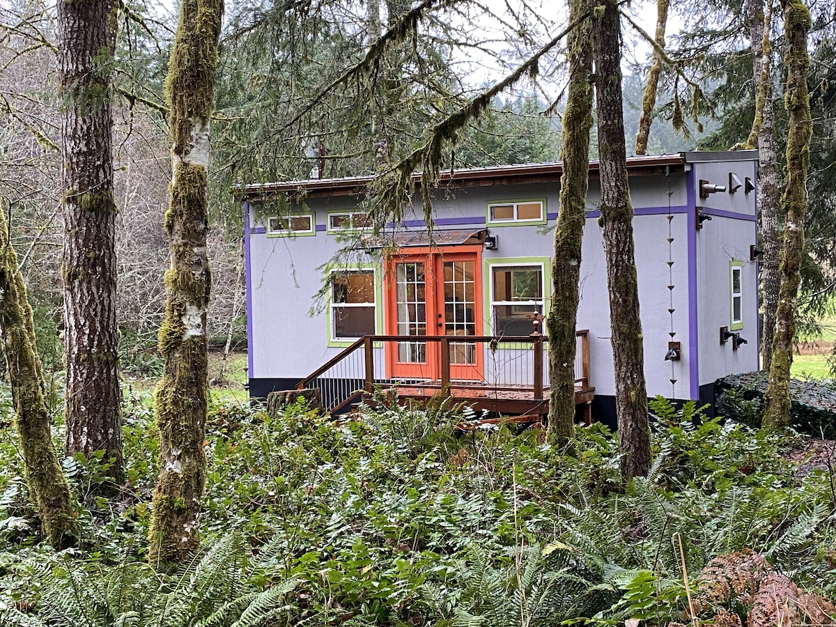 Bain sult as do shaoire fhoirfe sa chábán meidhreach lámhdhéanta seo atá suite i gcoill Clatskanie. Éalaigh ón meileann laethúil agus lig do scíth sa teach beag bídeach uathúil sómasach seo. Lig do scíth le caife preasa úrghrúdaithe na Fraince, bailigh le chéile timpeall an phoill dóiteáin, agus bí ag amharc ar na réaltaí tríd an spéirléas. Faigh blaiseadh den fhíor - cheardaíocht agus den dearadh ildaite a fhágann gur tearmann teolaí é an teach beag bídeach seo. Is é seo an áit is fearr le léamh, le do scíth a ligean agus le díphlugáil i nglacadh an dúlra! *Tá cat lasmuigh againn.