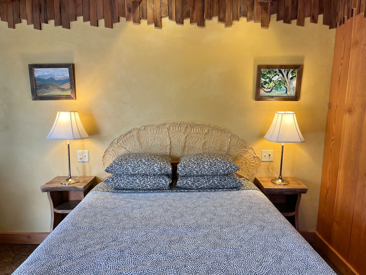 Tá Myrtle Falls Suite at The Peak suite in Packwood (ní Randle) agus trasna ó Longmire Springs Brewing. Is stiúideo cluthar é ina bhfuil leaba rí atá deartha do lánúineacha atá ag iniúchadh Mt. Rainier agus White Pass. Le dathanna teolaí sléibhe agus nuashonruithe tuisceanacha, is iontach an áit í an tearmann pearsanta seo chun do scíth a ligean tar éis lae amuigh faoin aer. Lig do scíth i do leaba mhór chompordach, bain sult as snámh sa tobán/cithfholcadán, agus socraigh isteach le haghaidh tráthnóna ciúin le chéile.