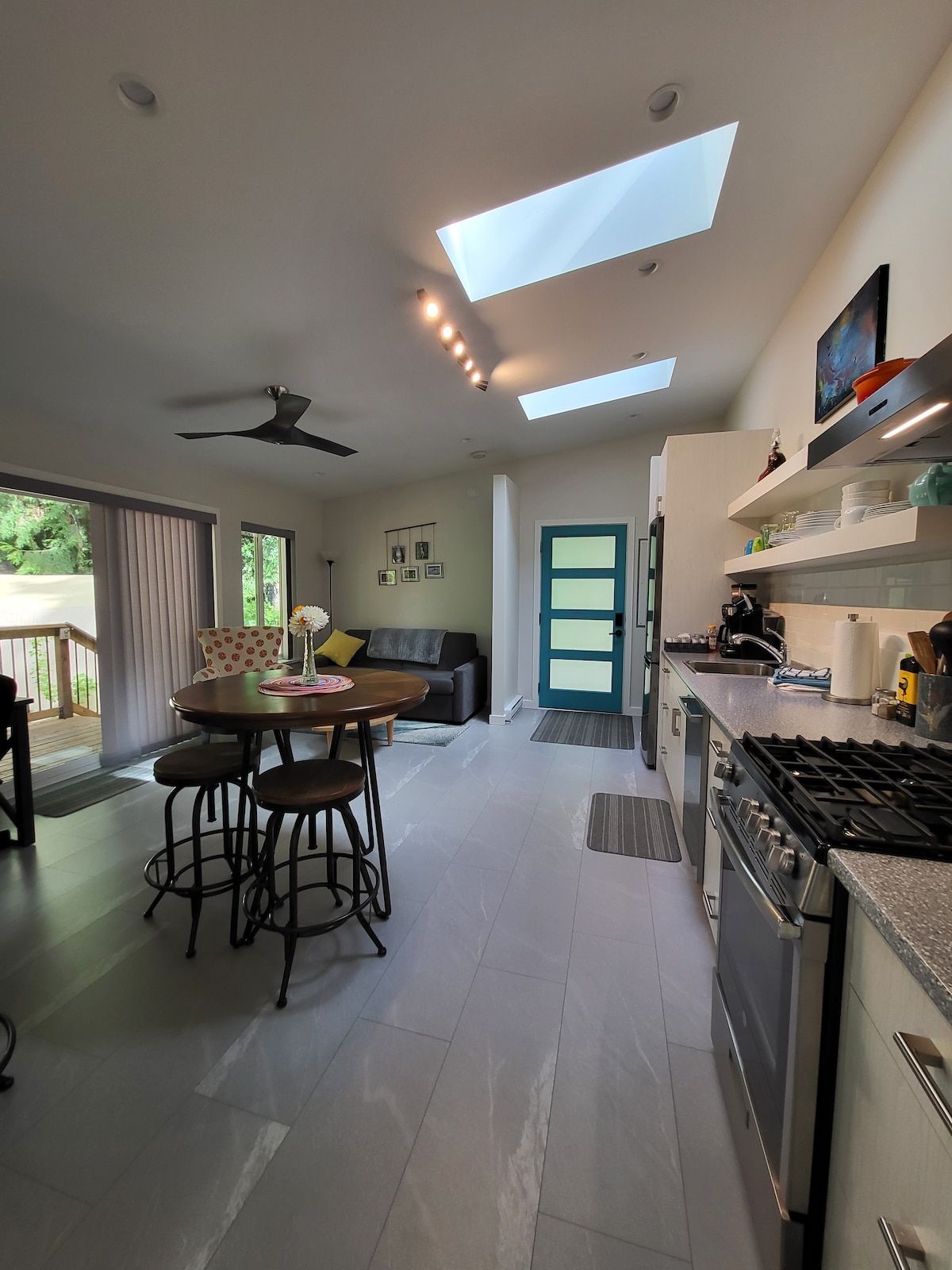 Gheobhaidh tú svuít mhór atá lán le solas nádúrtha agus coziness. Fágann an chistin lánfheistithe go bhfuil sé deacair an béile is fearr leat a chócaráil chun taitneamh a bhaint as ag an mbord itheacháin nó os comhair an teilifíse ag breathnú ar Netflix (ná déan dearmad an teallach a chasadh air) cuireann an seomra leapa flare éadrom agus leaba chompordach ar fáil chun codladh suaimhneach a chinntiú. Tóg do chaife maidine amach go dtí an paitió cúil agus lig do scíth le coo's na Morning Doves. Cuireann an svuít stóráil tucked ar shiúl le haghaidh bagáiste agus aon fhearas spórt geimhridh/samhraidh.