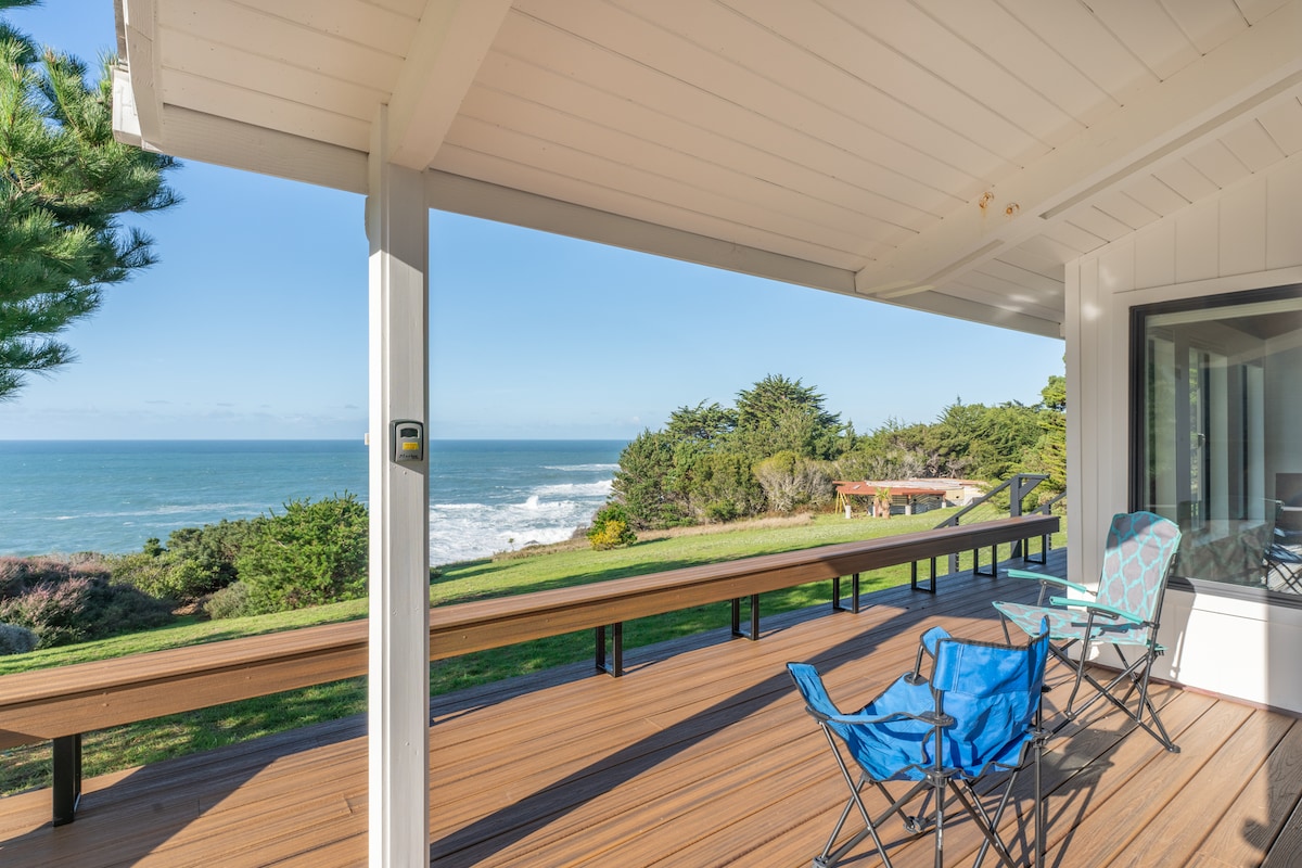 Teachín cois farraige ar an mbarr gorm le radhairc iontacha ar an Aigéan Ciúin agus ar Chósta Mendocino. Tá ár linnte taoide féin againn! Príobháideach fós áisiúil do Downtown Fort Bragg. Níl sé ach 5 mhíle ó Mendocino. Téigh a chodladh le tonnta a rushing inár dteach grianmhar & síochánta. Wi - fi, cistin iomlán agus gach fearas. Cistin & seomra folctha athchóirithe. Iontach sunsets agus stargazing iontach! I measc na rátaí tá cánacha lóistín. Is féidir é a chur in áirithe le "Radharc an Aigéin ar a bhfuil rochtain ar an gcósta" do ghrúpaí níos mó.