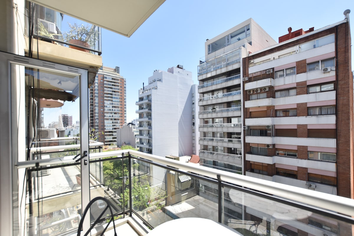 Árasán álainn ar urlár ard. Radhairc nach féidir a shárú ar an gcathair, Rio de la Plata agus Staidiam River Plate. Ideal do 2 dhuine, leaba banríona. Cistin lánfheistithe. Oigheann leictreach/sorn, cuisneoir w/reoiteoir, micreathonnán, déantóir caife, pábhála leictreach, tóstaer. Aerchóiriú, teilifís chliste, wifi. Seomra folctha iomlán. Ar Av Del Libertador, comharsanacht Belgrano, le rochtain éasca ar phointí turasóireachta agus oibre. Tairiscint gastranómachais, ollmhargaí, ICBA, Fleni agus pointí spéise cúpla bloc ar shiúl.