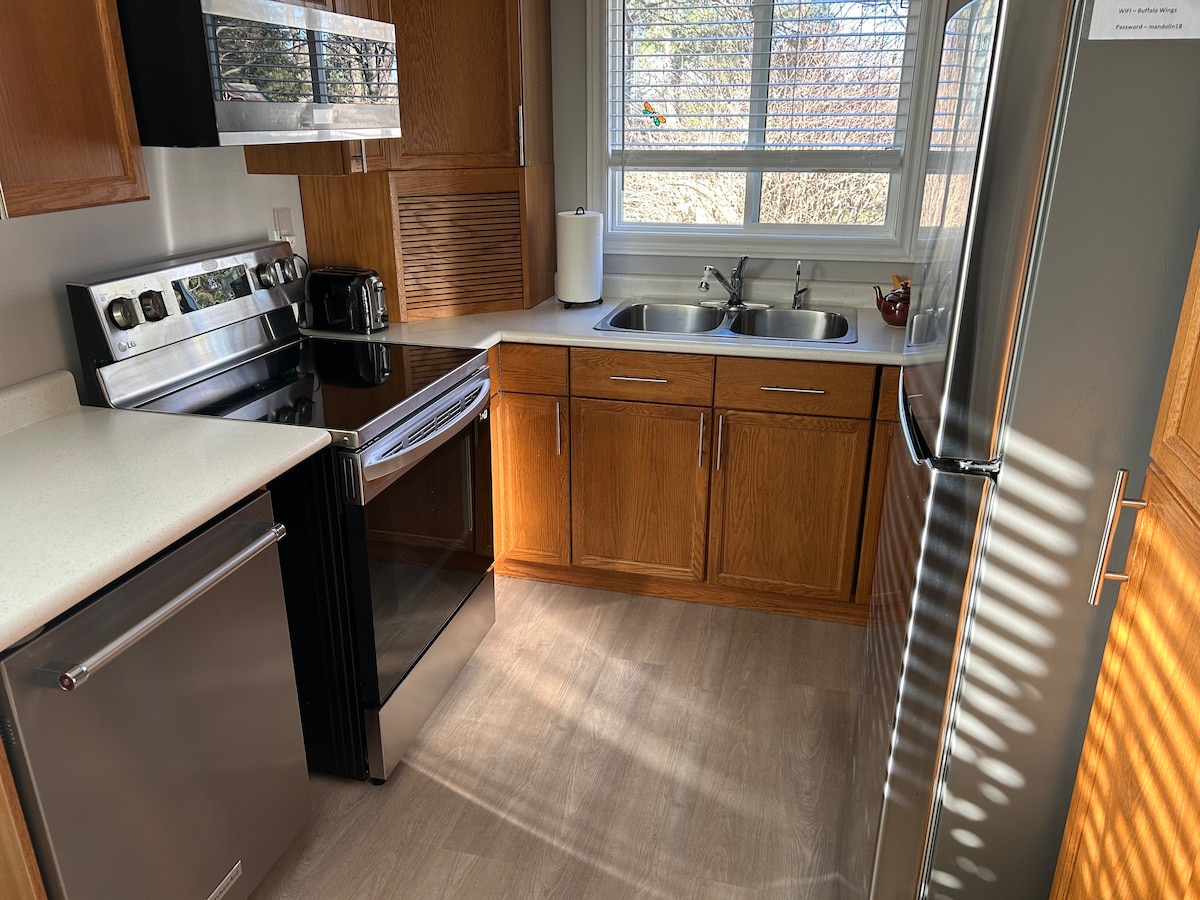 Tá gach rud a theastaíonn uait le haghaidh d'fhanachta do KW san árasán seo! Suite céimeanna ó pháirc na hAbhann Móire agus Joe Thompson, tá flúirse dúlra le hiniúchadh agus tú sa bhaile mór. Pointe lárnach idir Kitchener agus Waterloo, tá sé níos lú ná nóiméad ar shiúl ó Highway 85 agus tiomáint 5 nóiméad chuig Uptown Waterloo nó i lár an bhaile. Tá ospidéal abhann mór, Ollscoil Waterloo agus Ollscoil Laurier níos lú ná tiomáint 10 nóiméad freisin. Bonn idéalach chun iniúchadh a dhéanamh ar a bhfuil le tairiscint ag KW!