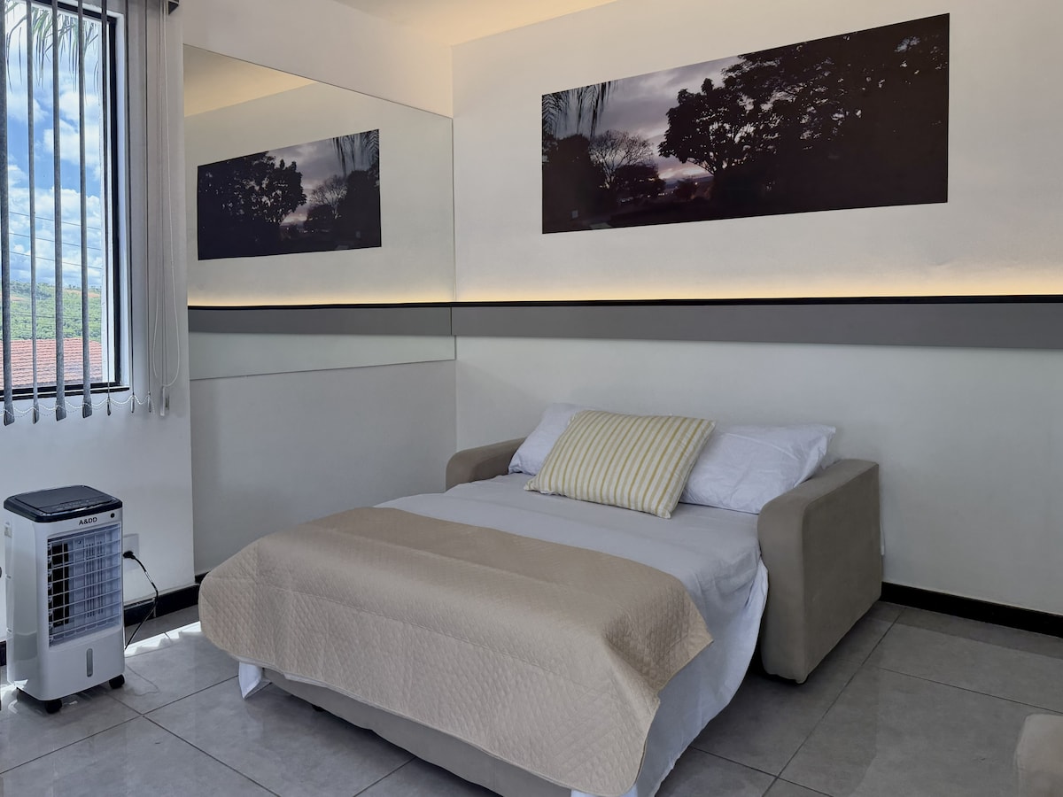 Teach príobháideach le spás chuig an seomra leapa. Seomra folctha príobháideach (ní en - suite), cistin, balcóin, linn snámha agus páirceáil. In aice le hAerfort Confins, CT Atlético, Cathair Riaracháin, Aquabeat agus RBC Kartadrome. NÍ cheadaímid cóisirí. NÍ cheadaímid fuaim na ngluaisteán. NÍ cheadaímid ceol den chineál "Funk". Fuaim chomhthimpeallach AMHÁIN roimh 10pm. Tost IOMLÁN i ndiaidh 10 p.m. agus roimh 8 a.m.