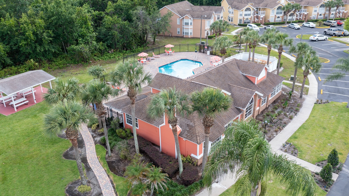 Bain sult as saoire saor in aisce ag Storey Lake Resort. Lonnaithe díreach nóiméad ó Disney, Falcon's Fire Golf Club, Universal, Epic Universal, SeaWorld, Orange County Convention, Premium Outlets. Laistigh de 1 mhíle Walmart, Sprioc agus bialanna, beidh gach rud a theastaíonn uathu ag do theaghlach. Páirc Uisce, Spórtlann, agus na saoráidí go léir SAOR IN AISCE. Páirceáil saor in aisce, slándáil 24/7 san ionad saoire geata seo agus le seiceáil isteach uathoibríoch le heochair rochtana dírí agus ardaitheoir ar fáil
