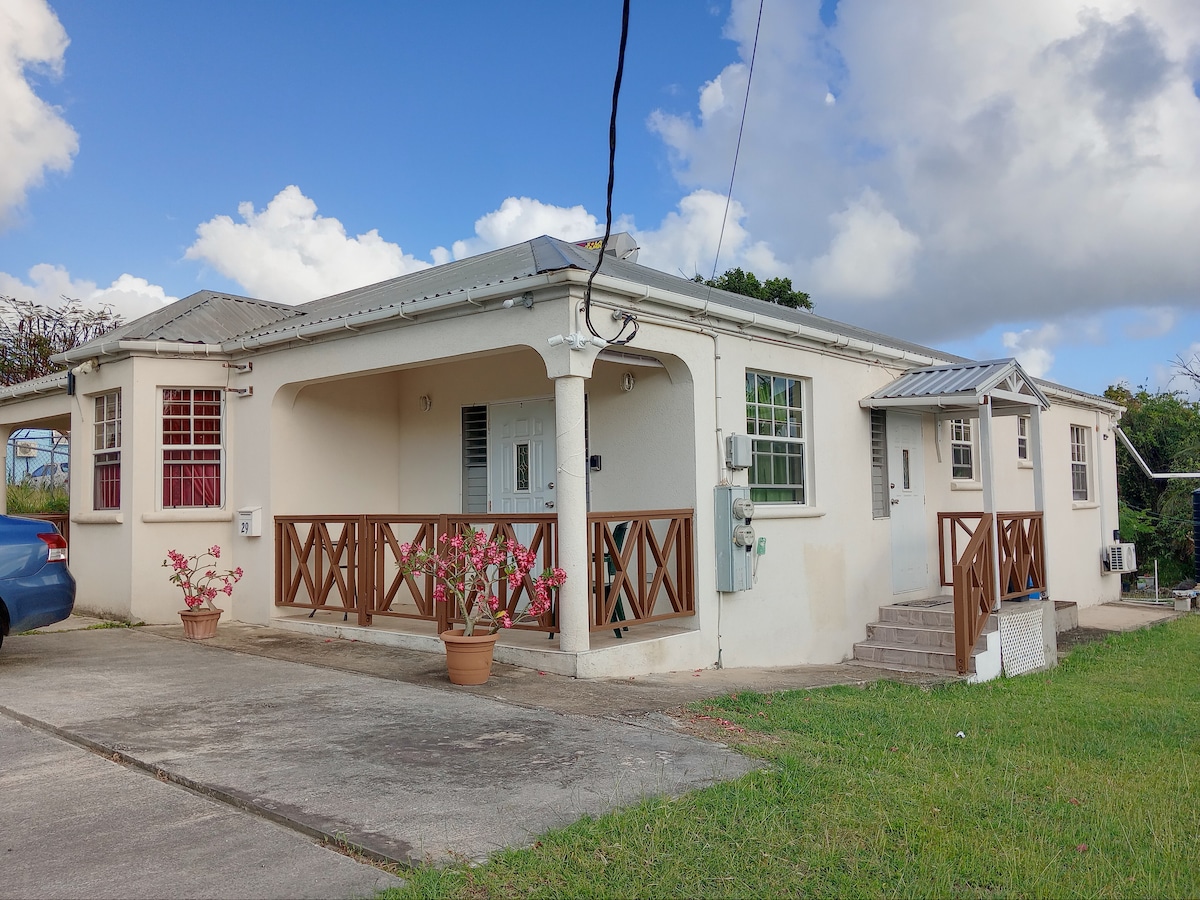 Tá an t - árasán seo suite go lárnach i gceantar an - síochánta. Tá faiche timpeall air, laistigh de cheantar cónaithe atá gar do shiopaí agus do bhialanna éagsúla. Tá sé 10 nóiméad sa charr chuig Ambasáid Mheiriceá, 5 nóiméad chuig Sky Mall agus 20 nóiméad chuig Bridgetown. Tá an t - árasán seo fairsing ina bhfuil cistin, áit chónaithe agus itheacháin lánmhéide, seomra folctha compordach agus seomra leapa mór. Tá Wi - Fi saor in aisce, micreathonnán, cuisneoir, sorn, oigheann, teilifís, cithfholcadán uisce te agus veranda beag ann.