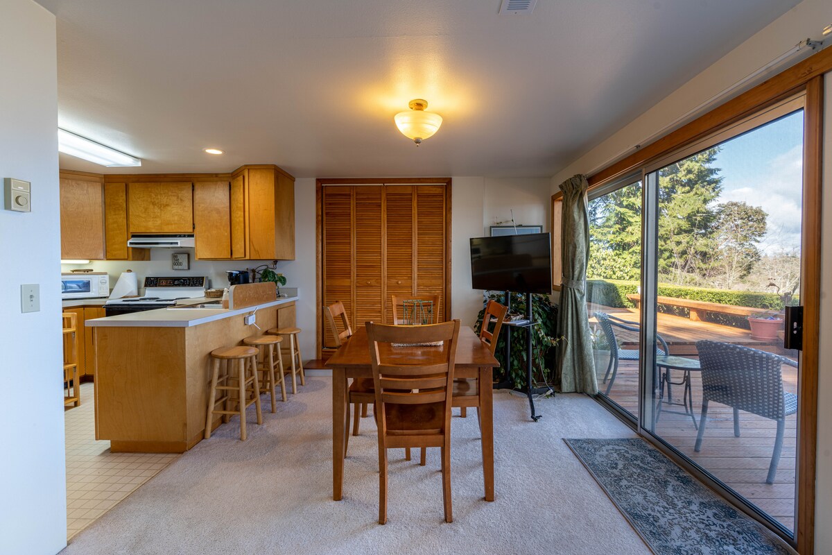 Bain sult as radhairc áille ar an mbá agus ar thacair ghalánta na gréine trí na fuinneoga móra pictiúr a chuireann fáilte romhat chuig Bayview House. Breathnaigh ar an bhfiadhúlra áitiúil lena n - áirítear fianna agus éin éagsúla agus tú ag ól do chaife maidine. Is áit iontach é an poll dóiteáin lasmuigh ar imeall an uisce chun róstadh s'amóir agus do scíth a ligean tar éis lá eachtraí chuig tránna, lochanna, dumhcha agus cosáin fánaíochta gan deireadh in aice láimhe. Cuirtear gach rud a bheidh uait chun sneaiceanna tapa nó béile gourmet a ullmhú sa chistin gheal lánfheistithe. Cuidíonn cúr cuimhne leapacha barr, línéadach cadáis 100%, agus tuáillí boga le fanacht compordach a chinntiú. Gheobhaidh tú gach rud a theastaíonn uait le bheith ar do shuaimhneas lena n - áirítear teilifíseáin CHLISTE le cábla, Wi - Fi ardluais, meaisín níocháin agus triomadóir, earraí níocháin, seomra cluiche le tábla foosball, agus neart cluichí boird, puzail, leabhair agus bréagáin do pháistí. Is áit iontach é Bayview Home do theaghlach nó do ghrúpa cairde chun taitneamh a bhaint as Cósta álainn an Deiscirt Oregon! Is féidir Bayview House a ligean ar cíos freisin i gcomhar le Bayview Cottage, teach níos lú a bhfuil áit chodlata ann do 4 aoi agus atá suite díreach béal dorais. Smaoinigh ar an dá theach a ligean ar cíos le chéile do chóisirí níos mó nó do chruinniú inar mian le teaghlaigh a spás féin. Le chéile is féidir leis an dá theach freastal ar chóisirí 8 agus tá cistin iomlán agus meaisín níocháin/triomadóir i ngach teach! Tá áit álainn lasmuigh ag teach Bayview ina bhfuil poll dóiteáin, binse agus bord. Le linn ardtide is féidir leat Seas Suas Paddle nó cadhc díreach ón gclós cúil. Tá cosáin ann a théann timpeall na bá. Is minic a thugann fiadhúlra, egrets, fianna agus géanna ar cuairt díreach ar ais! Táim ar fáil ar an bhfón, ar théacs nó ar ríomhphost ag am ar bith le linn d'fhanachta. Táim i mo chónaí in aice láimhe má theastaíonn rud ar bith uait agus tú ag an teach. Tá an teach suite cúpla bloc ó Downtown North Bend, baile beag cois cósta ina bhfuil siopaí, bialanna, siopaí seandachtaí agus tithe tábhairne. Lonnaithe ag bun bóthair chiúin in aice le páirc dúlra a thugann go leor deis chun breathnú ar fhiadhúlra lena n - áirítear fianna agus go leor éan. Turas gearr chuig roinnt tránna agus dumhcha gainimh ar feadh lae lán d'eachtraí lasmuigh. Tá neart páirceála do do bhréagáin lena n - áirítear báid agus leantóirí ar fáil. Tá Cúrsa Gailf cáiliúil Dhumhach Thrá Dhroichead na Bandan níos lú ná tiomáint 30 nóiméad ar shiúl! Is áisiúil an rud é nach bhfuil ach cúpla bloc amach ó Mhórbhealach an Chósta Sárscéimhe agus turas tapa 5 nóiméad chuig aerfort North Bend. Tá an teach inrochtana go hiomlán le rampa suas go dtí an doras tosaigh agus doirse leathana ar fud an tí. Tabhair faoi deara freisin nach bhfuil aon bhac idir an clós agus an t - uisce (ag taoide ard). Caithfear maoirseacht a dhéanamh ar leanaí chun sábháilteacht a chinntiú.