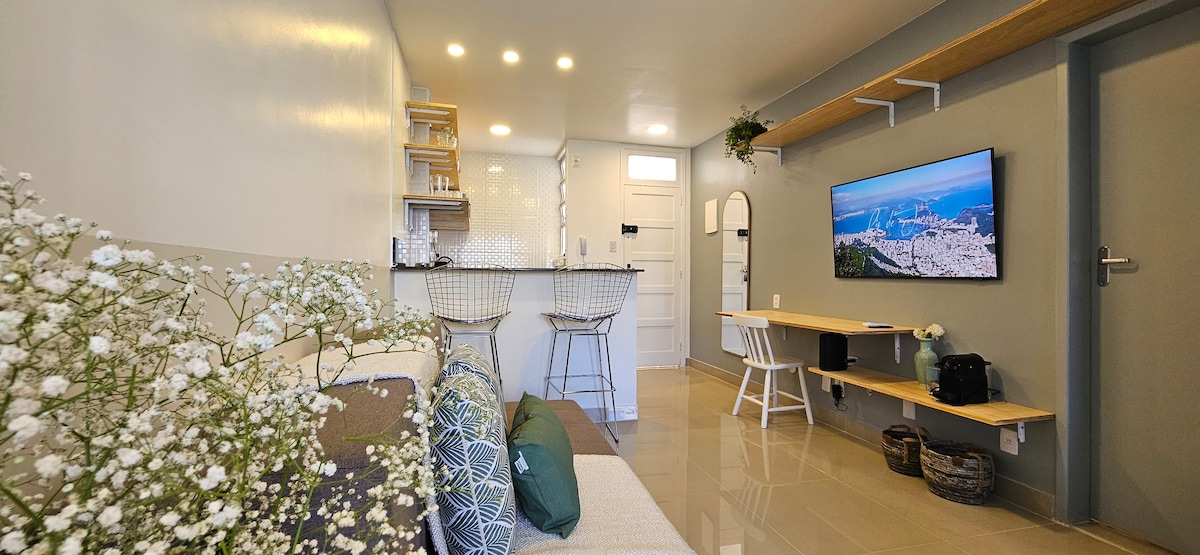 Tá a stíl féin ag an áit uathúil seo, tá sí athchóirithe, radharc álainn ar an Fuascailteoir Chríost, tuathúil agus simplí ag an am céanna agus atá compordach. Nice terracinho beag le Ofuro, beárbaiciú agus spás gourmet. Máistirshraith leathan le tobán te Cistin comhtháite sa seomra suí, mothú taitneamhach amplitude. I gcroílár Copacabana, gar don mheitreo, siopaí, ollmhargaí agus bloc amháin ón trá.