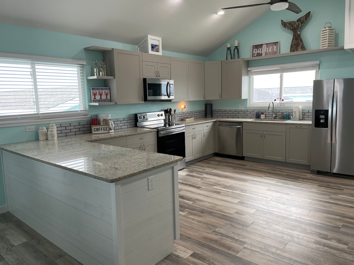Bain sult as ár dteachín bá scíth a ligean! Tá an teach fairsing seo foirfe duit chun saoire ghearr ag an deireadh seachtaine a óstáil le do theaghlach nó le turas iascaireachta le teacht le chéile. Níl ach bloc amháin taobh amuigh den bhá, siúl 10 nóiméad go dtí an trá nó lár an bhaile, & díreach trasna na sráide ó bheár & gríoscán áitiúil. Is meascán é an teach seo a nuashonraíodh le déanaí measctha le charm bunaidh Rockport a oibreoidh le haghaidh ócáid ar bith. Déanta le haghaidh siamsaíochta nó díreach roinnt síochána agus ciúin. Tá an áisiúlacht suite timpeall gach cúinne! Seolfaimid cód príobháideach chugat nach bhfuil go maith ach le linn d'fhanachta. Greamaíonn an doras tosaigh le téamh agus fuarú an lae. Tarraing an doras i dtreo tú agus an cód á chur isteach agat, le do thoil. NÁ cuir glas AR ghlas hanla an dorais, le do thoil, mar glasálfaidh sé seo amach as an teach thú. Beidh tú in ann rochtain a fháil ar sheomraí uile an tí seachas doirse atá faoi ghlas. Tá rannóg clós cúil ann atá lasmuigh de theorainneacha. Cuirfear lipéad air agus ná téigh isteach ann. Go raibh maith agat as meas a léiriú ar na teorainneacha sin. Déan teagmháil linn má tá aon cheist agat. Níl cónaí orainn in Rockport, déan teagmháil linn má bhíonn éigeandáil de chineál ar bith ann. Tá cabhair áitiúil againn más gá Níl ár Teachín ach siúlóid 10 nóiméad nó tiomáint cúpla nóiméad chuig Rockport Beach agus Downtown Rockport. Níl an bá ach 1 bhloc ar shiúl trasna na sráide Broadway iontach chun breathnú ar ardú na gréine, iascaireacht nó faire ar éin. Tá Poor Man Country Club díreach trasna na sráide ón teachín agus tá bia agus deochanna beáir maithe ann má roghnaíonn tú. Páirceáil éasca ag Fisher Bay Cottage agus siúlóid ghearr go Rockport Beach agus Downtown Rockport. Is féidir leat Cart Gailf a fháil ar cíos le linn do chuairte nó do charr a thiomáint timpeall.