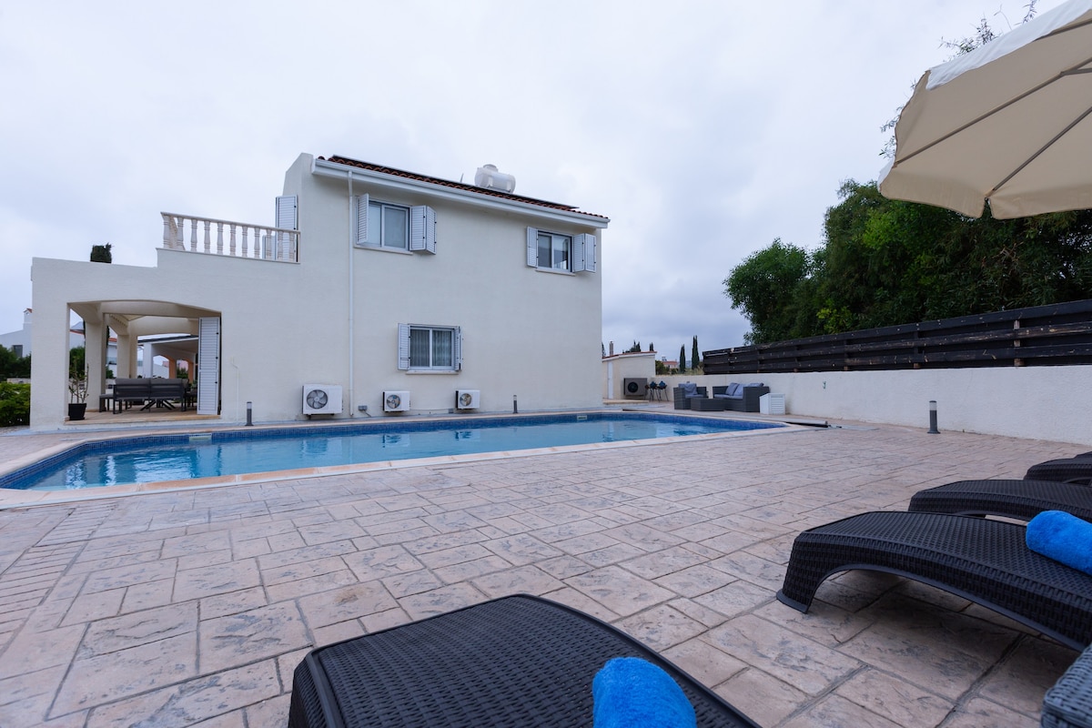 Villa sómasach 3 leaba, ina bhfuil linn snámha phríobháideach, gairdíní móra agus áiteanna móra luí gréine. Tá radharc farraige ar leith ag an Villa ón mbalcóin. Siúlóid 3 - 5 nóiméad ó phríomh - stiall Chuan na Coiréal. 300 méadar go dtí an trá. Tá tránna áille gainmheacha Chuan na Coiréal laistigh de shiúlóid 10 - 15 nóiméad. Ritheann seirbhís rialta bus go Cuan Paphos lena margaí dordánacha, siopaí agus bialanna cois farraige. Tá an villa maisithe go blasta agus cuimsíonn sé na compord tí go léir a mbeifeá ag súil leo agus i bhfad níos mó.