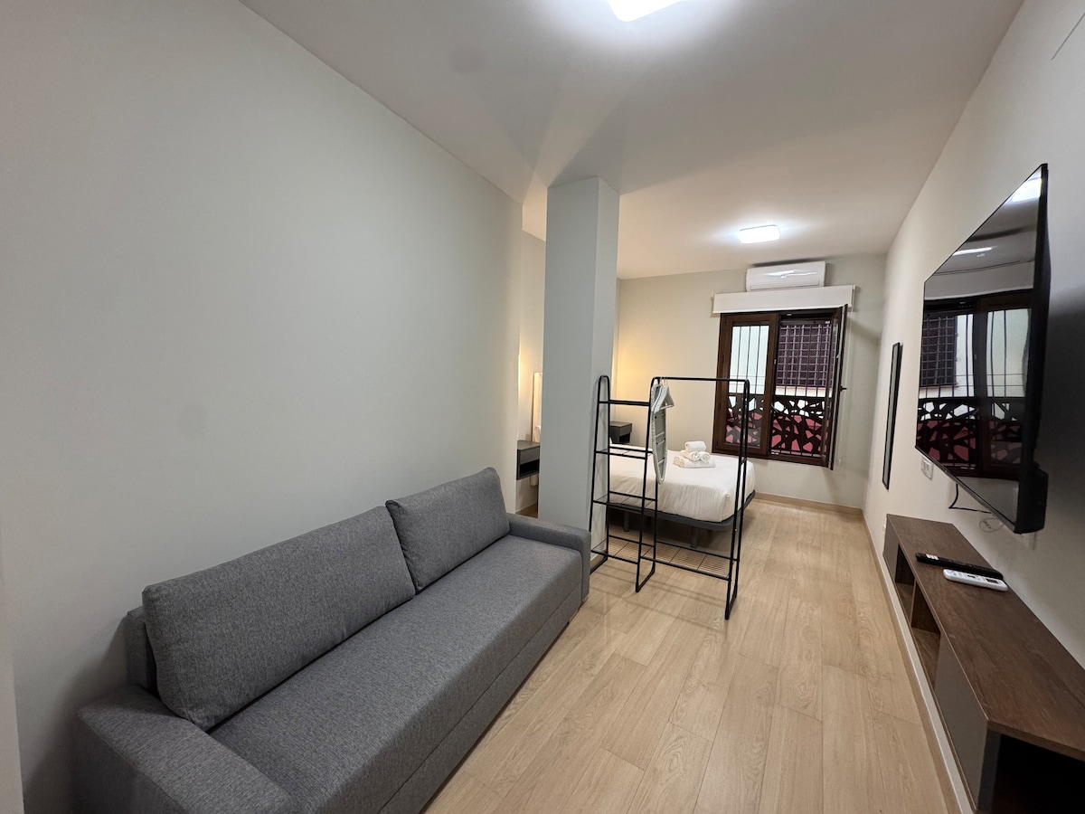 Fan san árasán gleoite nua - athchóirithe seo, atá maisithe le cúram speisialta chun taobh istigh uathúil a choinneáil, canbhás tábhachtach den Bhalla Rómhánach. Tá sé suite i gcroílár an ionaid stairiúil, in aice le cladach Guadalquivir. Stiúideo iontach do lánúineacha, tá dearadh nua - aimseartha, oscailte agus geal ann, sa leithreas is féidir leat a bheith buíoch as cuid mhaith den Bhalla Rómhánach. Tá gach rud ann a theastaíonn uait chun cúpla lá a chaitheamh ag baint taitnimh as Cordoba. gar do thithe tábhairne, bialanna agus áiteanna fóillíochta.