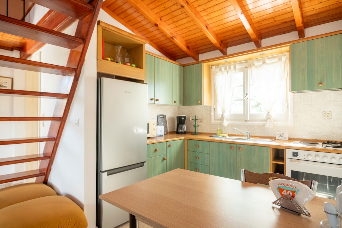 Teach scoite le vearanda agus ardán clúdaithe. Tugann bord bia ina bhfuil cathaoireacha, scáth fearthainne, tolgairí agus gríoscán leictreach cuireadh duit luí in airde. Suite go hálainn i lár gairdín mór ina bhfuil seanchrainn olóige. Foirfe do lánúineacha agus do theaghlaigh bheaga. Seomra suí feistithe le leaba thoilg do bheirt (140x205 cm) agus áit itheacháin chomh maith le cistin oscailte. Sa seomra leapa in aice láimhe, tá leaba dhúbailte (160x200 cm). Seomra folctha le doirteal, cithfholcadán báistí, leithreas agus meaisín níocháin.