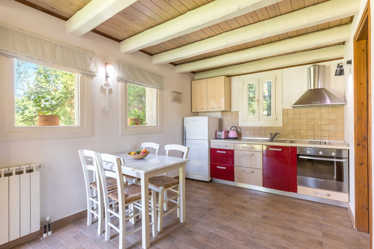 Teachín beag barántúil atá lán de charachtar, fíor - iontach i ngach gné, a tógadh in 2017 tá 1 seomra leapa, 1 seomra folctha agus áit oscailte ann ina bhfuil an chistin, an tábla itheacháin agus an seomra suí. Cuireann sé saoire rómánsúil ar fáil do lánúineacha a lorgaíonn coscán síochánta, suite go foirfe idir cósta agus tuath le haghaidh scíthe ar aon dul leis an tírdhreach, i measc olóige ársa garrán agus crainn torthaí eile, siúlóid 1'ó thrá Avlaki.