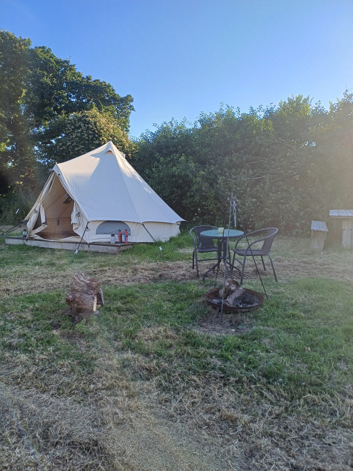 Fanacht ar eispéireas feirme. Úsáid aonair as cobhsaí agus cochall oiriúnaithe. Is féidir leis an gcobhsaí 4 a chodladh le dúbailte agus 2 shingil an cochall dhá cheann eile le singlí. Tabhair leat d'éadaí leapa féin, le do thoil. Cithfholcadán agus leithris chomhroinnte Gan leictreachas. Is áit iontach é seo chun dul ar saoire ar feadh oíche nó dhó Tá bord picnice agus limistéar beárbaiciú lasmuigh den phuball cloigín/cochall. Seid bheag chistine. Tá sé ar ghabháltas beag le capaillíní, capaill, asal, éanlaith chlóis agus is féidir iad ar fad a fheiceáil go laethúil. I bhfad ag siúl ó thrá.