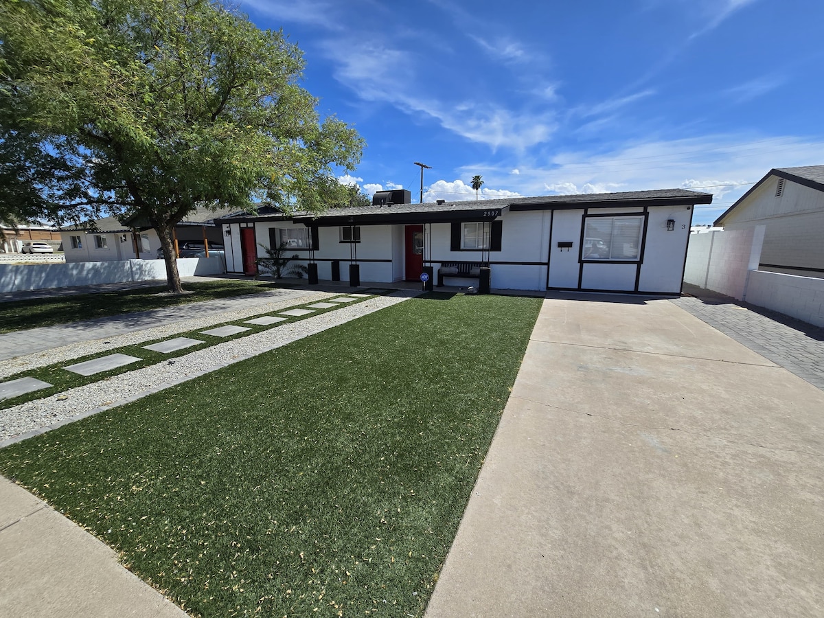 In aice le hOspidéal Chlinic Mhaigh Eo, atá lonnaithe i gcomharsanacht chiúin in Paradise Valley Village, cuireann ár dteach atá athmhúnlaithe go hiomlán, an fanacht foirfe ar fáil do lánúineacha, do theaghlaigh nó d'aíonna gnó. Bain sult as Wi-Fi tapa, seomra oibre tiomnaithe, meaisín níocháin/triomadóir, páirceáil SAOR IN AISCE le geata RV, agus cistin gourmet. Lig do scíth tar éis eachtraíochta sa chúlchlós fairsing le cluichí poll coirnéil, nó seónna ragairne ar an teilifíseán 75 ″. Miontuairiscí ó fhánaíocht, galf, bia, agus nithe is díol spéise in Phoenix. 15 nóiméad/11 mhíle go dtí Aerfort - tá do shaoire ghearr san fhásach ag fanacht leat!