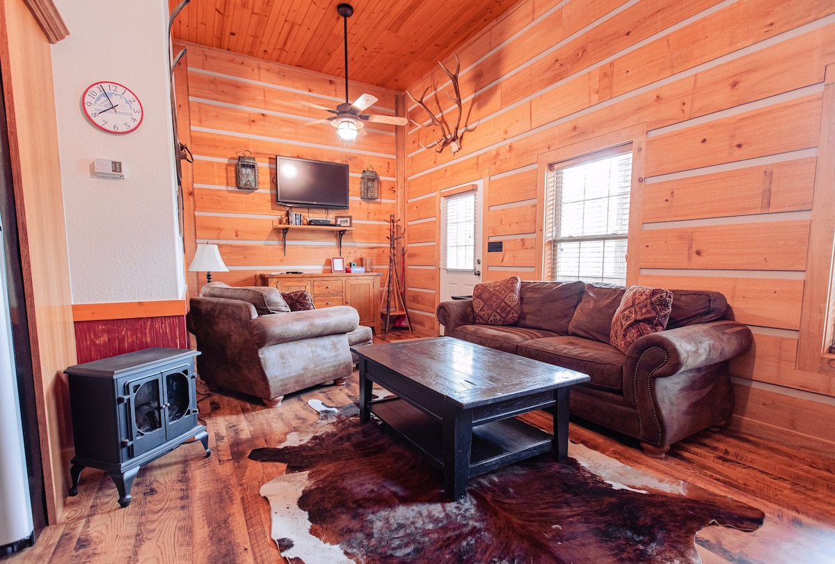 Lig do scíth leis an teaghlach ar fad ag an gcábán síochánta seo sa tír. Timpeallaithe ag coillte, cnoic rollta agus neart fiadhúlra le féachaint orthu. Is siúlóid dheas é lochán suas an cnoc de réir a chéile taobh thiar den chábán. Lonnaithe i gcroílár Three Rivers Wine Trail, tá neart fíonlanna le cuairt a thabhairt orthu, chomh maith leis an ngrúdlann áitiúil is fearr linn, an Wooly Pig. Tá tobán mór te le taitneamh a bhaint as ar an deic taobh amuigh atá mór go leor do 8 nduine.