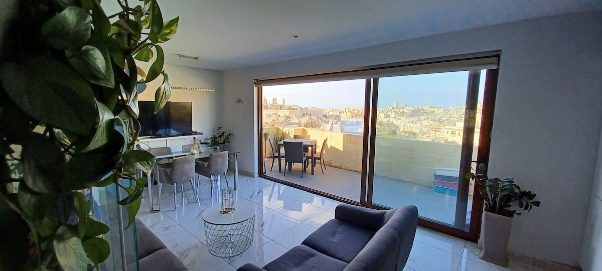 Teach baile mór álainn sna 3 chathair stairiúil agus álainn. Tá an teach athchóirithe le déanaí de réir ardchaighdeáin, lena n - áirítear beárbaiciú agus tobán te le radhairc iontacha ar an Grand Harbour agus Valletta ón díon. Tá cistin nua - aimseartha lánfheistithe sa teach, limistéar tolglainne ina bhfuil tolg saincheaptha, oifig bheag agus dhá sheomra dhúbailte ina bhfuil en - suite. Tá dhá theilifíseán ann do Netflix (ní teilifís trastíre) agus Wi - Fi saor in aisce ar fud an tí. Molta do lánúin móide ar mian leo níos mó cultúrtha ná saoire cóisire.