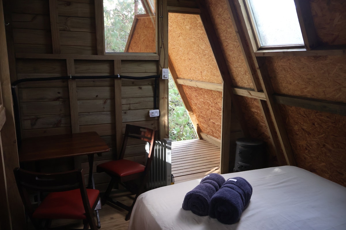 MIONCHÁBÁN FRAME A le balla claonta agus deic le radhairc iontacha! Tá: leaba dhúbailte, línéadach, tuáillí, clúdaigh, téitheoir, bord agus cathaoireacha, cuirtín dúghorm, solas, soicéid agus Wi - Fi sa bhothán. STRUCHTÚR CÚPLA CÉIM: 2 sheomra folctha iomlána, seomra folctha, cistin fheistithe agus ofurô. ROINNTEAR na háiseanna seo idir aíonna ó na 5 chábán. Tobán te ar fáil ach coinne a dhéanamh agus táille sheirbhíse a íoc. Tá Glampáil Amanita i limistéar cosanta comhshaoil 20,000m ina BHFUIL EAS agus COILLTE PRÍOBHÁIDEACHA