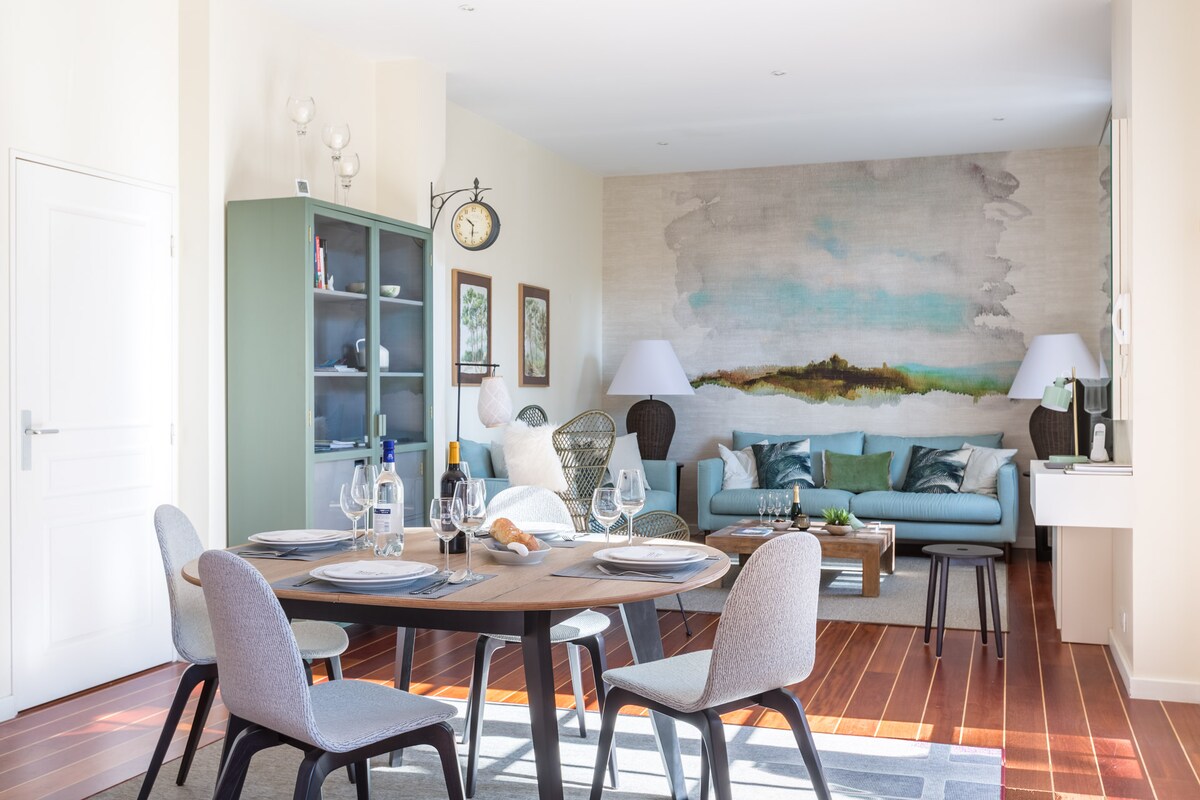 ⚠️ Níl fáil ar pháirceáil ar: 14 agus 15 Lúnasa don Fhéile Mhara (d'fhéadfadh 13 agus 16 Lúnasa a bheith san áireamh) Díolachán ceardaithe 21, 22 agus 23 Lúnasa Árasán le balcóin agus páirceáil – lár chathair Arcachon Bain sult as fanacht i gcroílár Arcachon (Baile Samhraidh) san árasán teolaí seo ina bhfuil balcóin agus páirceáil phríobháideach ar fáil (+ €10/oíche). Suite díreach trasna na príomhthrá, is é an pacáiste foirfe é do lánúin atá ag lorg compoird agus gach rud laistigh d'achar siúil.