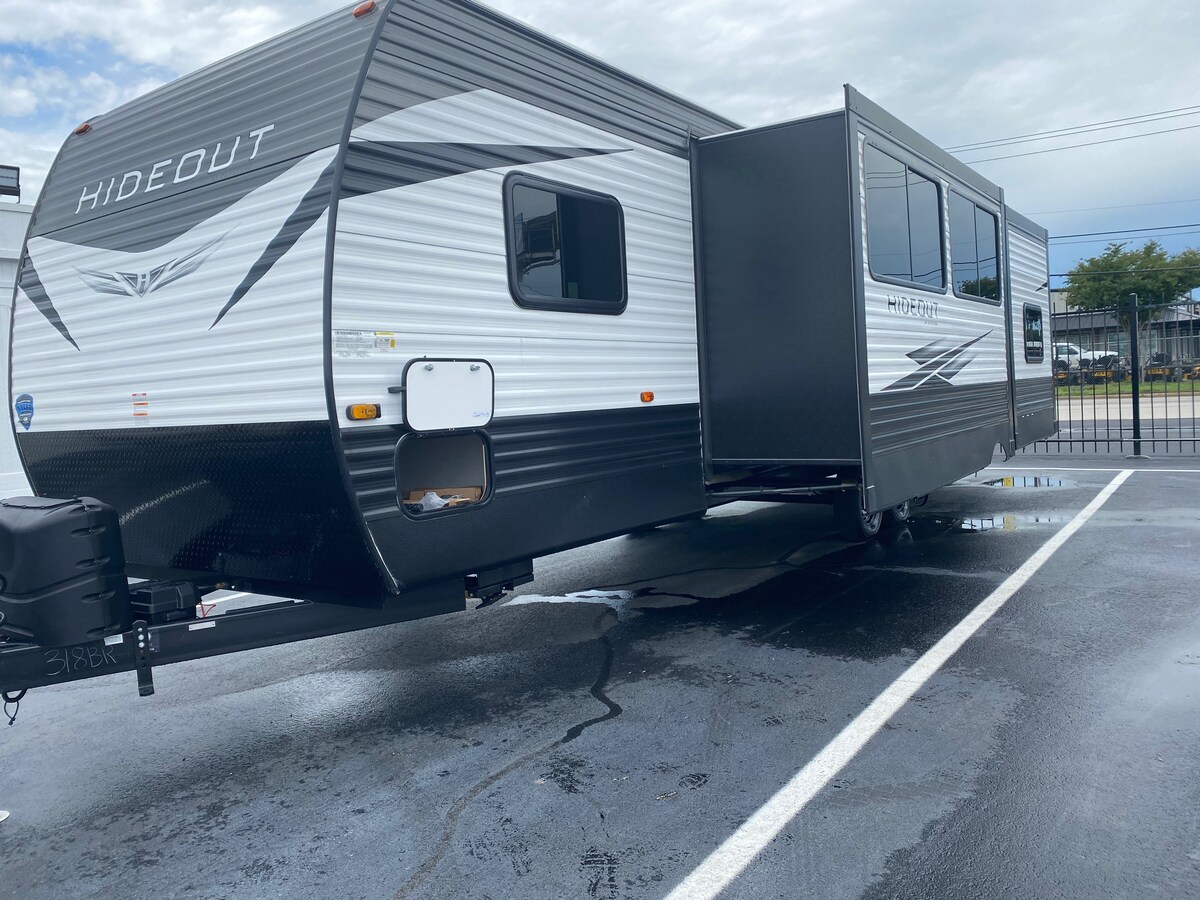 Tabhair faoi deara go bhfuil an veain champála seo stóráilte ag mo theach agus go gcuirfear ar bun sa chabhsa é. Is féidir leat áirithint a dhéanamh le haghaidh ionad campála ar do chostas, gearrfar táille bhreise ar sheachadadh agus ar chur ar bun. Leantóir taistil 2021 a chodlaíonn 10! Cistin lasmuigh, tá 4 leaba i dteach bunc ar féidir leo suas le 6 leaba a chodladh. Déanann sorn, cuisneoir lánmhéide, tábla agus tolg araon ina leapacha. Teallach, teilifís, steirió le cainteoirí laistigh agus lasmuigh. Tá leaba bhanríona sa seomra leapa. Tá rugaí lasmuigh, gráta poll dóiteáin le haghaidh cócaireachta agus go leor eile san áireamh!