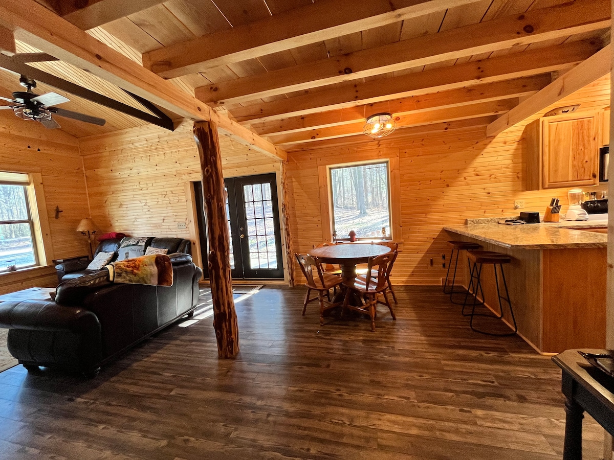 Cábán Logála nua - athchóirithe le piliúir, braillíní, tuáillí nua. Réadmhaoin adhmaid in aice le creek. Bain sult as scagadh sa phóirse tosaigh nó sa deic chúil le Swimspa 14 troigh, poll dóiteáin agus gríoscán i suíomh ciúin coillteach. Sábhálann pas Free State Park $ 7 lá. Máistir thíos staighre le leaba rí. 2 leaba bhanríona i seomra leapa lochta. Teallach leictreach w/5 settings, AC/heat, Wi - Fi/idirlíon ardluais, teilifíseán CLISTE le barra fuaime Bluetooth, Teilifís Dhíreach, Meaisín níocháin/triomadóir. Déantóir oighir. Cuirimid SEICEÁIL ISTEACH LUATH & SEICEÁIL AMACH AR fáil I GCÓNAÍ NUAIR A bhíonn SÉ AR FÁIL.