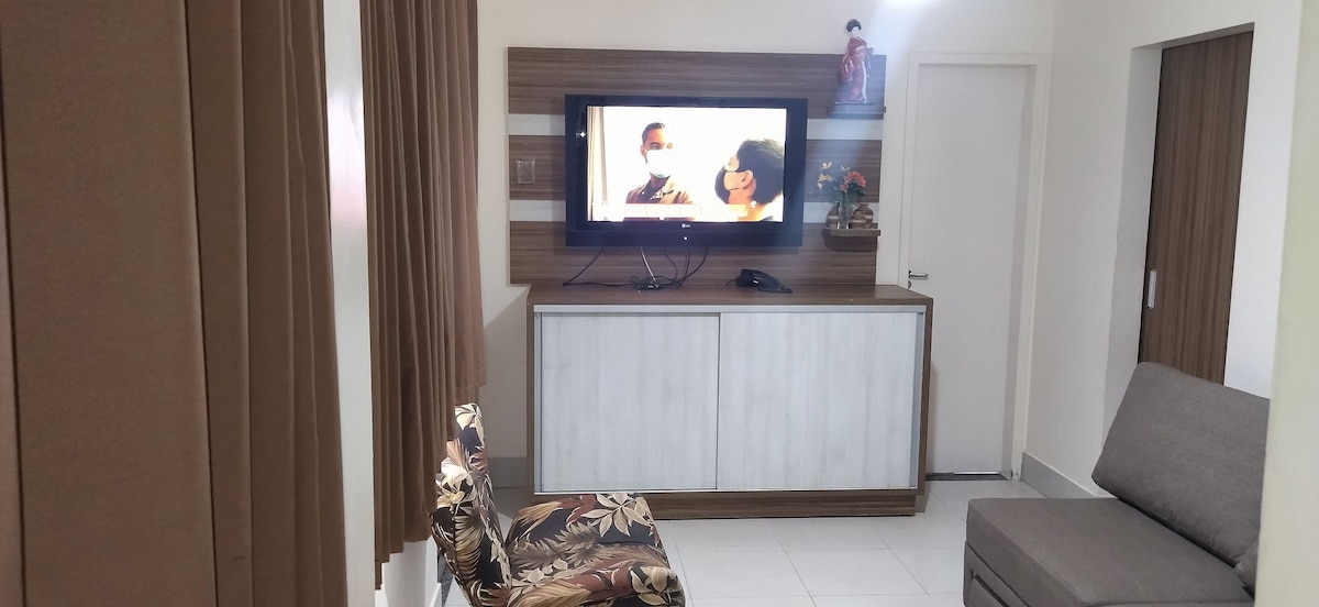 Máximo 4 pessoas incluindo adultos e crianças Ap localizado próx ao Aparecida shopping,supermercados, bancos e restaurantes. 2 andar (1 lance de escada) Sala - sofá de canto TV 42 com acesso à Internet e mesa de jantar. Cozinha - geladeira, cooktop 4 bocas, jogo de panelas,pratos, copos, talheres, itens para café e sanduicheira. Ar condicionado nos 2 quartos 1 ferro de passar 2 quartos 2 camas de casal possui lençol e toalhas. 1 banheiro 1 vaga de garagem wi-fi disponível