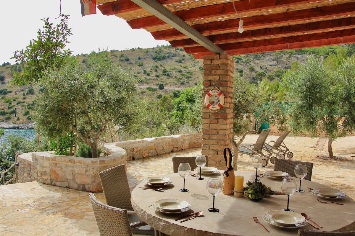 Is é 7 lá an FANACHT ÍOSTA i ngach tréimhse! 30 Bealtaine - 12 Meán Fómhair 2026. Dé Sathairn - Dé Sathairn amháin. Teach saoire cloiche 6 chiliméadar ó Milna, oileán Brac. Lóistín do 6 dhuine i 3 sheomra leapa (2 sheomra leapa le leapacha dúbailte agus 1 sheomra leapa le 2 leaba shingil), 2 sheomra folctha, 1 leithreas, agus cistin ina bhfuil bia agus seomra suí. Clós ina bhfuil cistin samhraidh agus áit itheacháin lasmuigh + tábla cloiche. Lonnaithe i mbá le trá le haghaidh scíthe iomlán. Radharcanna iontacha ag an mbá agus ag an bhfarraige, ag an aer úr, agus ag atmaisféar socair.