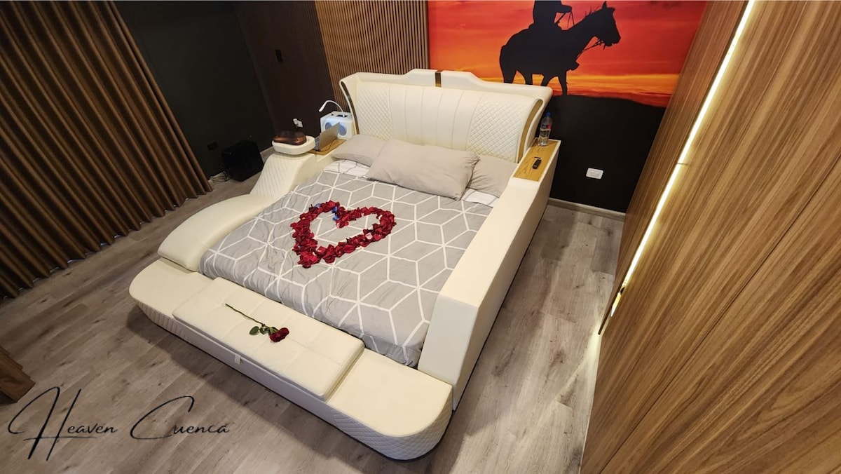 Is éard atá i Heaven Cuenca, a cruthaíodh chun SÓ agus compord a chur ar fáil, tá leaba inár seomra atá feistithe le córas fuaime Bluetooth, cathaoir suathaireachta ina mbeifeá i do chónaí eispéireas dodhearmadta, cistin aisling le rudaí beaga Amareto le trealamh iomlán geal dubh freisin comhdhéanta de ardán le radharc 360 faoi phribhléid inar féidir leat meas a bheith agat ar an ardeaglais, Turi agus luí na gréine iontach, ar ár n - ardán tá BBq parrila ann, salal atá feistithe Beo an t - eispéireas! Cumas 4 dhuine